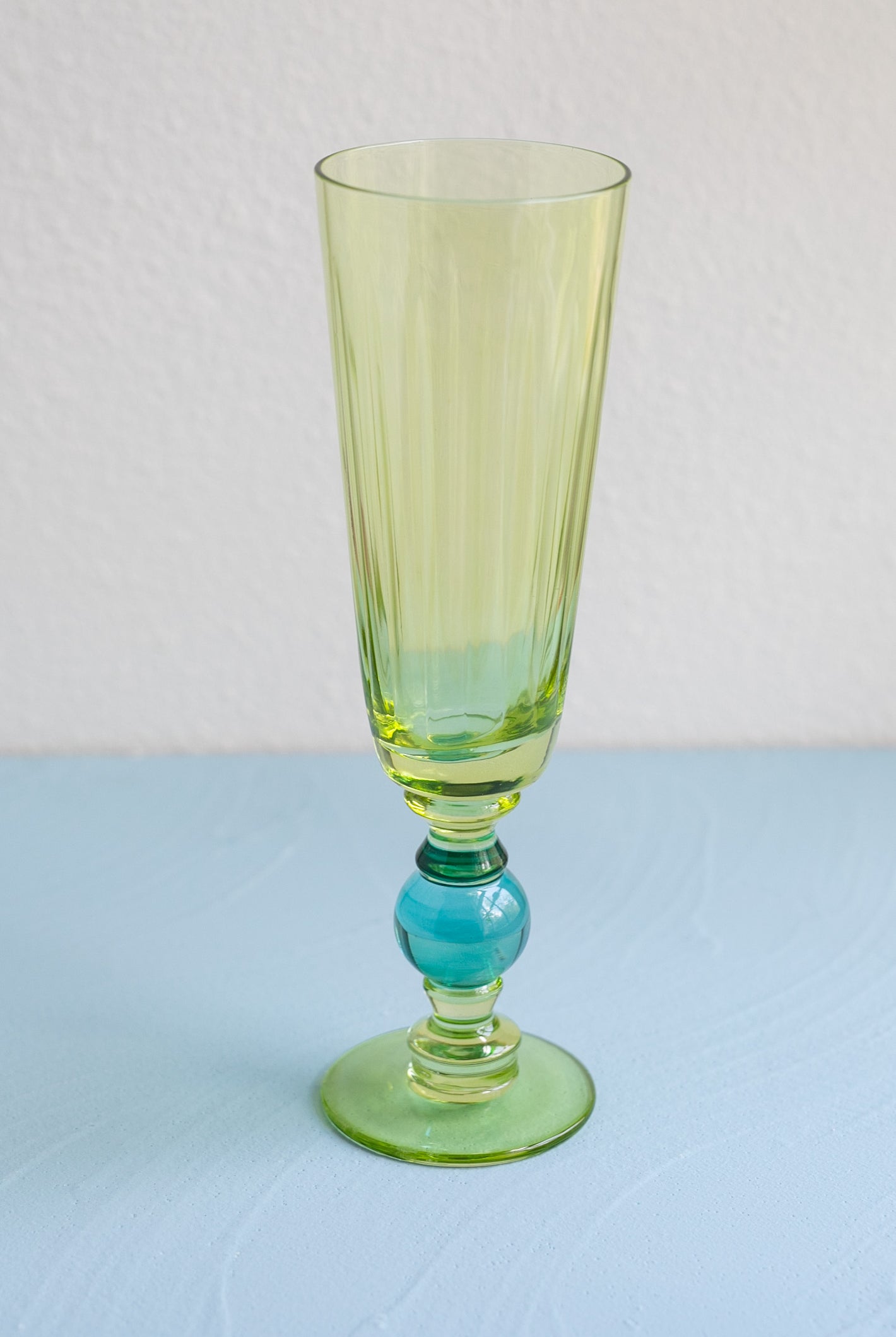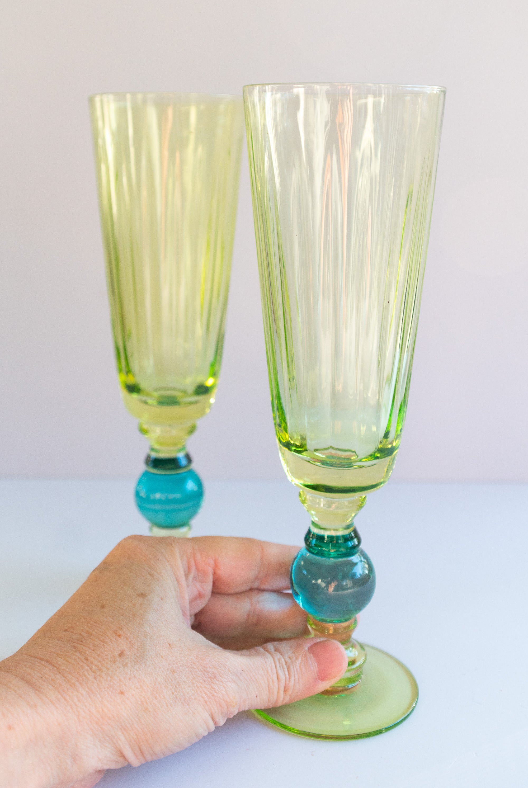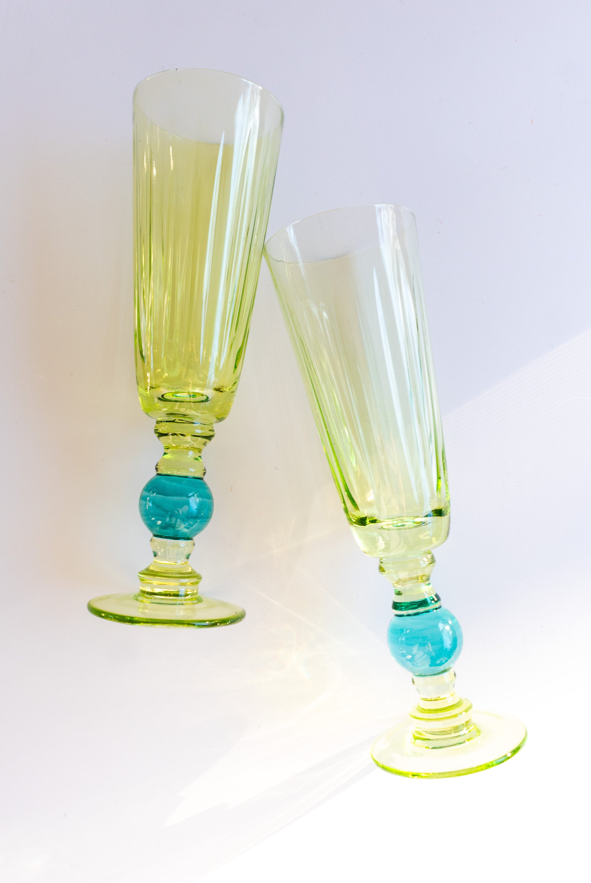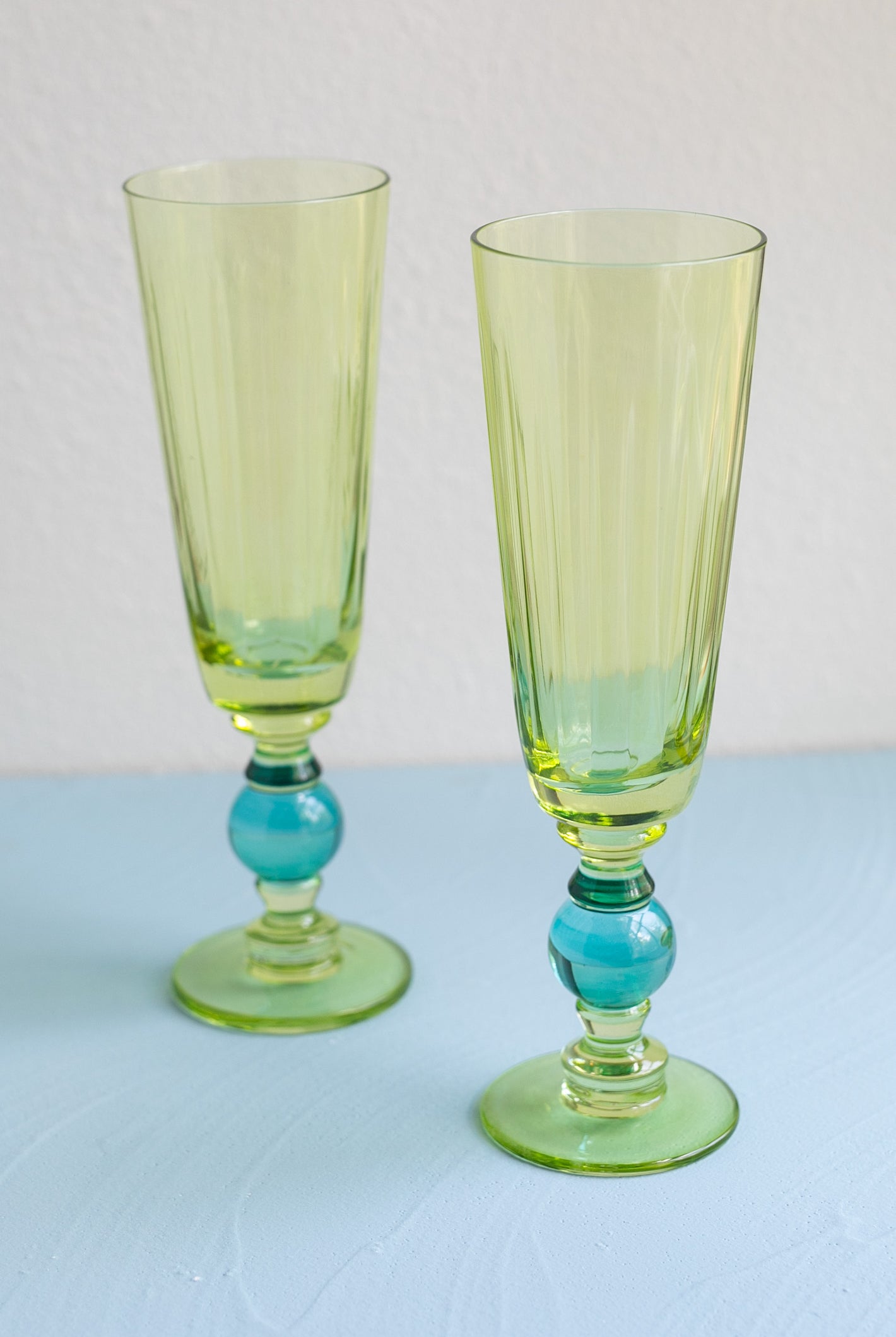 The perfect gift to bring to a host (or to update your own table setting), these green flutes with a pop of blue are a beautiful piece of functional art for your table.