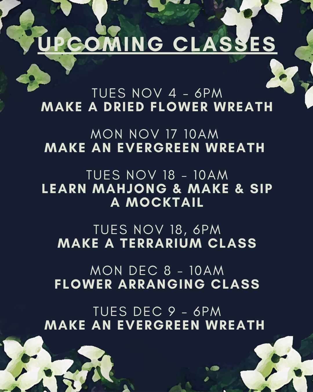 Upcoming classes at Gather Goods Co in downtown Cary in November & December including flower arranging, dried floral wreaths, learn to play mahjong, evergreen wreath and terrarium making.
