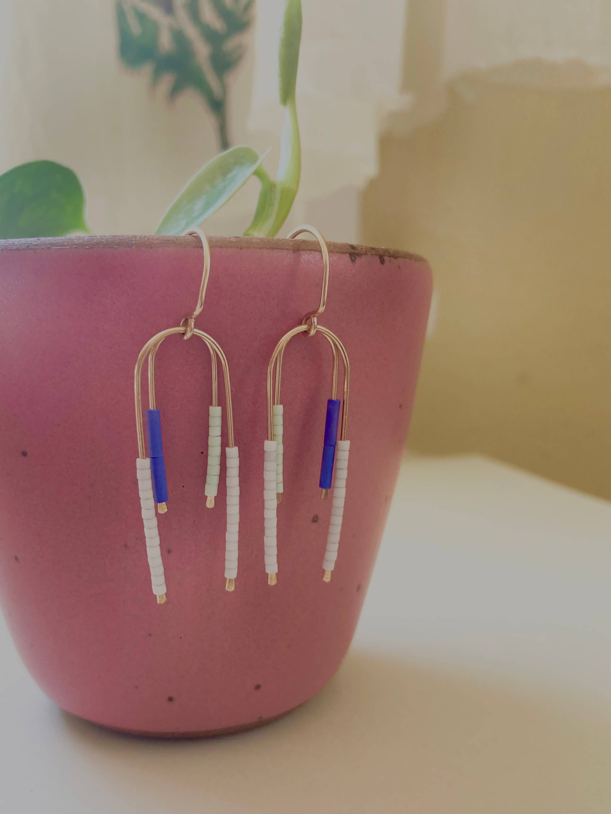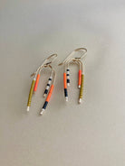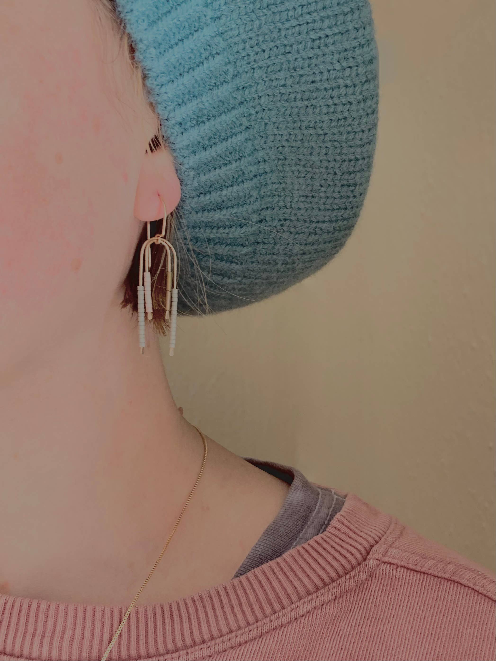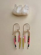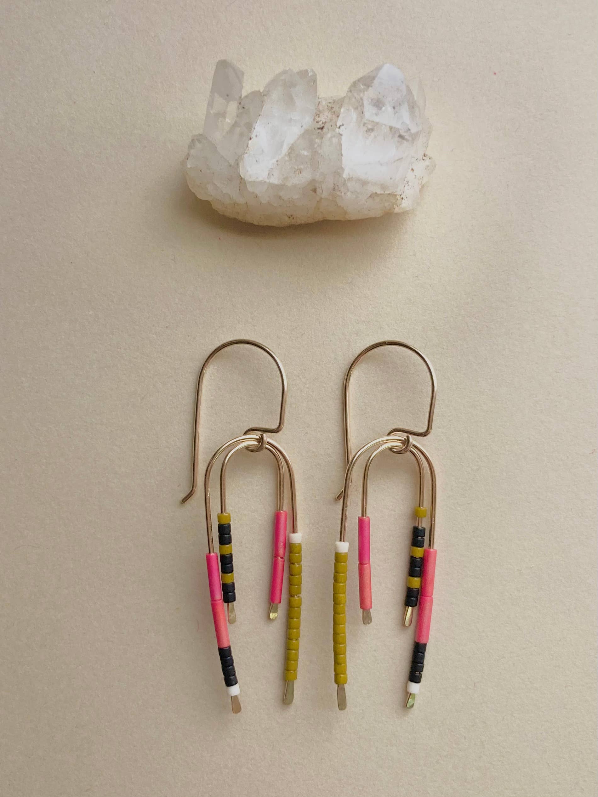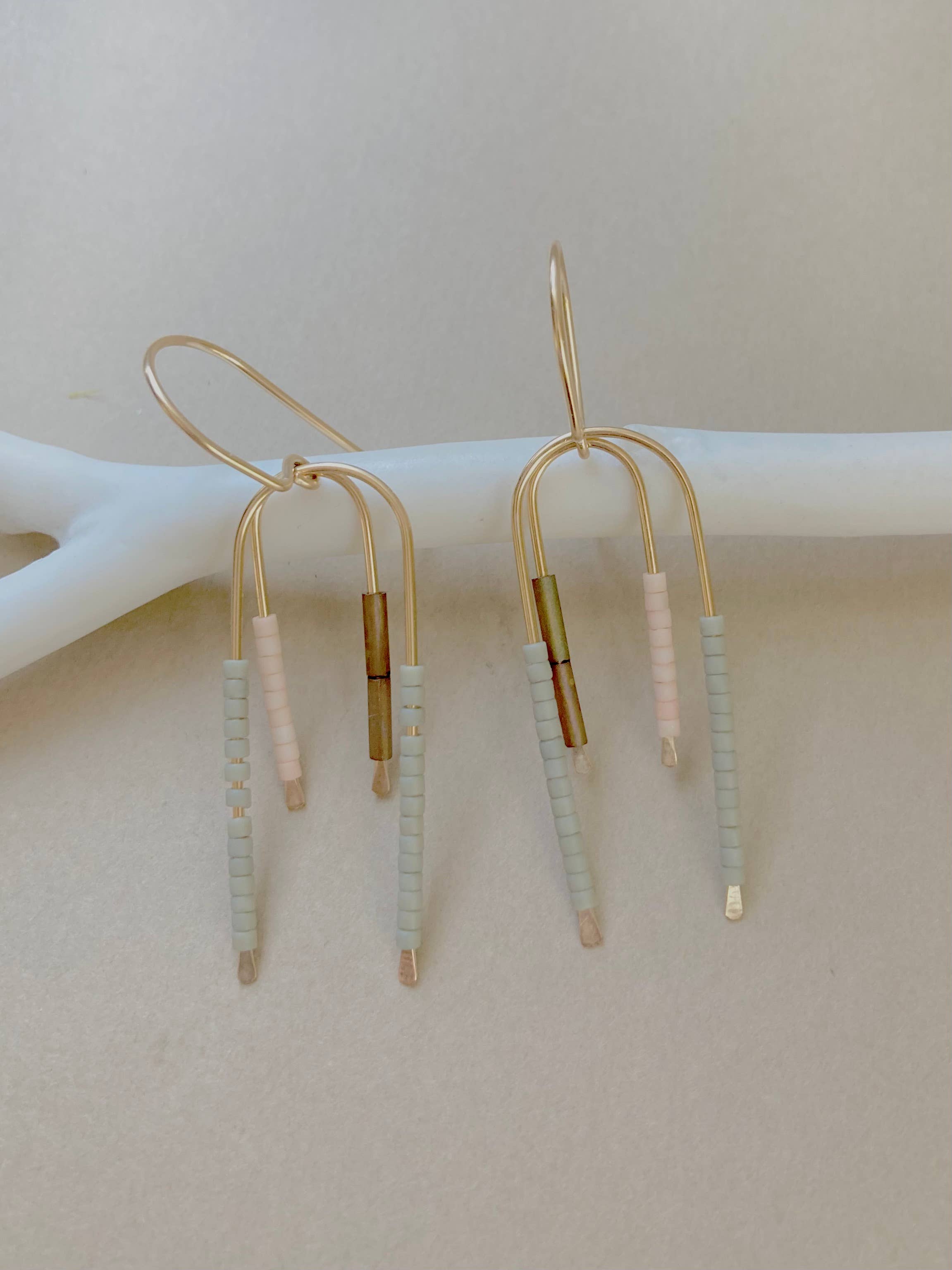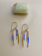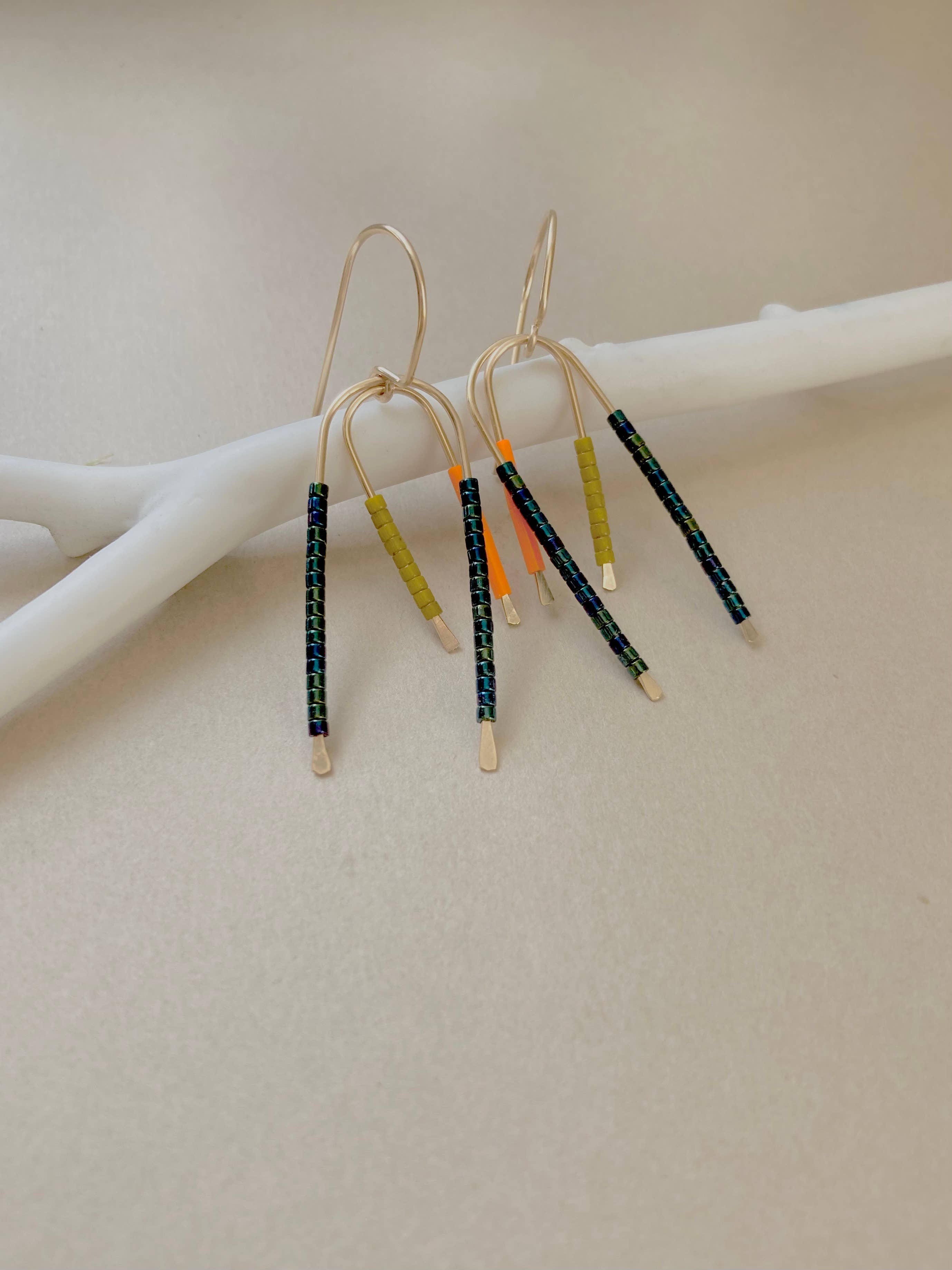 This earring features abstract form and hues inspired by botany, finished on hand-formed hypoallergenic 14k gold-filled components. 2" drop signature handmade earwires