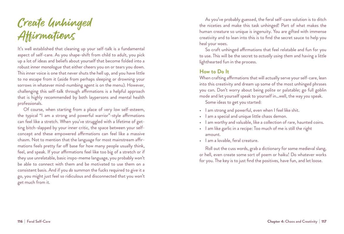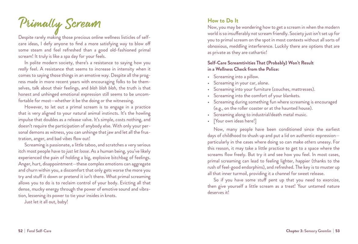 Feral Self-Care is loaded with self-care ideas that will actually help nourish your soul and make you feel good. Each entry covers an activity that reconnects you with your authentic self, helping you feel more empowered, free, and confident in embracing this human experience—in all its messy glory.