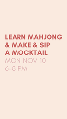 Join Gather Goods Co shop owner Michelle Smith and Mahjong instructor Mahjong With Elizabeth in this this laid-back and fun mahjong class. You'll learn how to make a simple mocktail that you'll get to drink in class while learning how to play mahjong minus the ladies who lunch vibes.