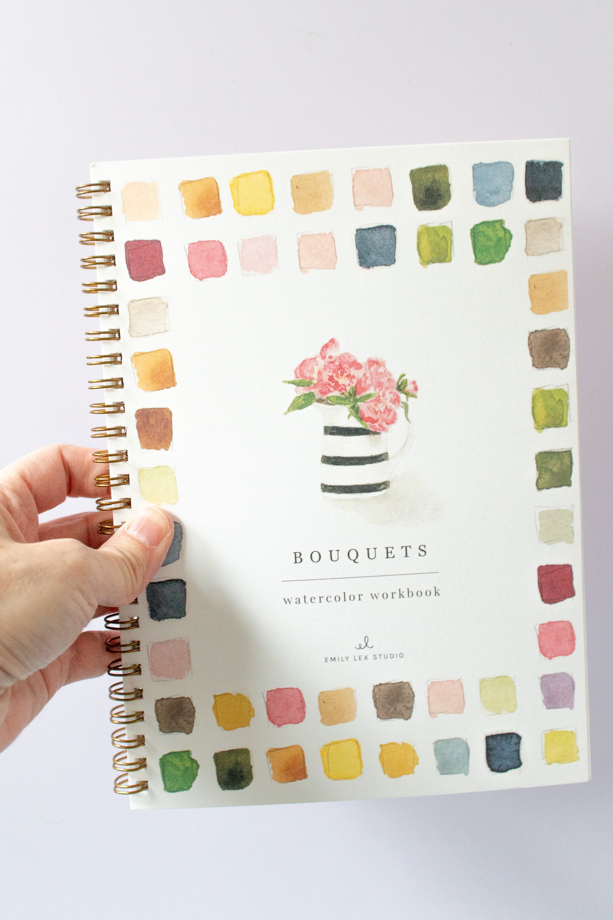 The Bouquets Watercolor Workbook includes 12 floral bouquet illustrations with an example of the finished painting, step-by-step instructions, and a lightly illustrated sketch for you to paint. It's just like a coloring book, but with watercolor! Enjoy this peaceful painting hobby on your own, with children, or with friends. Makes a wonderful gift and is perfect for artists of any age. Details: - 12 beginner-friendly illustrations - Thick 120lb watercolor paper - Lay-flat pages with spiral binding for hassle-free painting and easy tear-out - Lightly outlined sketches to guide you - Easy to carry, travel-ready 6.5" x 9" size - Paint sold separately.