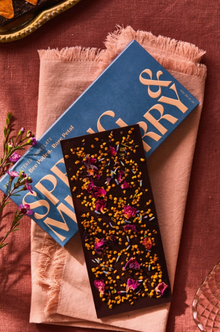 A fragrant trio of wild lavender, bee pollen, and hand-picked rose petals come together with the richness of this dark chocolate to create a soothing, subtly sweet treat reminiscent of spring.