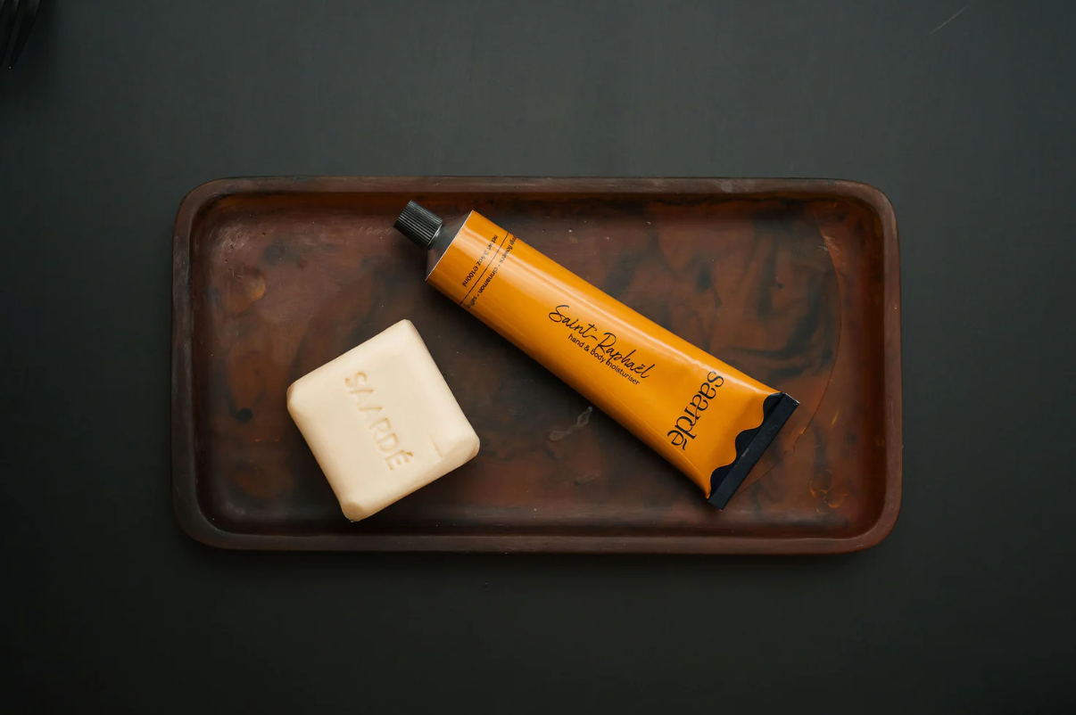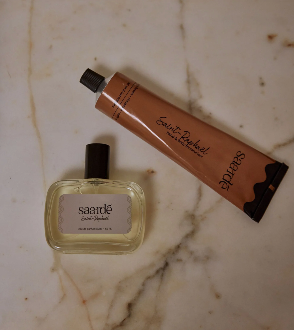 Deeply moisturising and nourishing hand and body moisturiser. Made in Australia using the highest quality ingredients including extra virgin olive oil. Scented with the signature Saardé fragrance - Saint-Raphaël. Feel: rounded · hot · lingering · joyful Notes: neroli · orange blossom · saffron · clove · lemon · musk and Amber Ingredients: Purified water, olea europaea (Australian extra virgin olive oil), prunis dulcis (sweet almond oil), cetearyl alcohol, PEG-20 stearate, theobroma cacao (cocoa butter), hamamelis virginiana bark/twig (witch hazel extract), vegetable glycerine, phenoxyethanol, caprylyl glycol, sorbic acid (preservative), rosa rubignosa (rose hip oil), cosmetic grade perfume