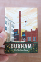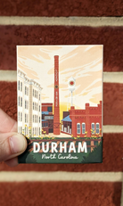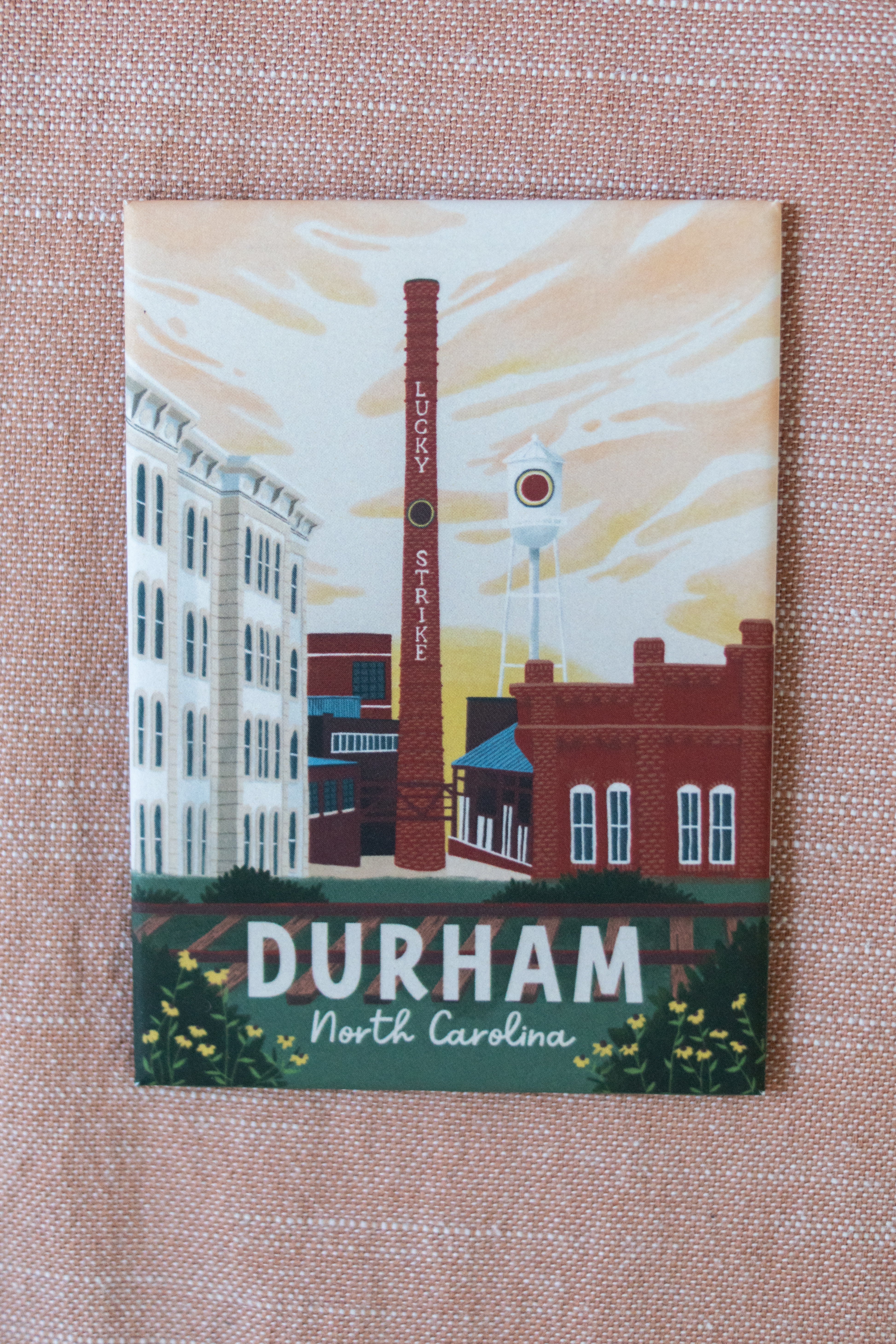 Created by a local Durham artist and inspired by vintage travel posters, this magnet is the perfect souvenir from the Bull City. Featuring a colorful, retro design of a sunset over the the American Tobacco Campus. Magnets are 2.5x3.5" and have a soft-touch matte finish, giving this vintage design a modern touch.