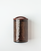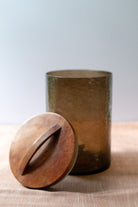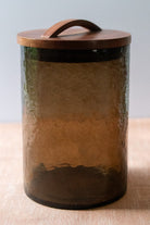 Beautifully textured glass paired with a hand-carved wooden lid makes these canisters the ultimate in stylishly functional home organization. Perfect for use in the kitchen or as an apothecary jar, each includes a rubber ring for an airtight seal. Hand blown then meticulously hammered by hand, these recycled glass canisters feature a beautiful pebbled texture and deep, earthy colors. They are topped with a striking hand-carved lid made from FSC certified mango wood. These items are 100% handmade and slight size variations and imperfections may occur. - Dishwasher safe. Canister measures 5 x 5.5 inches