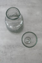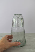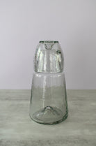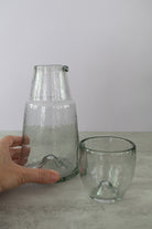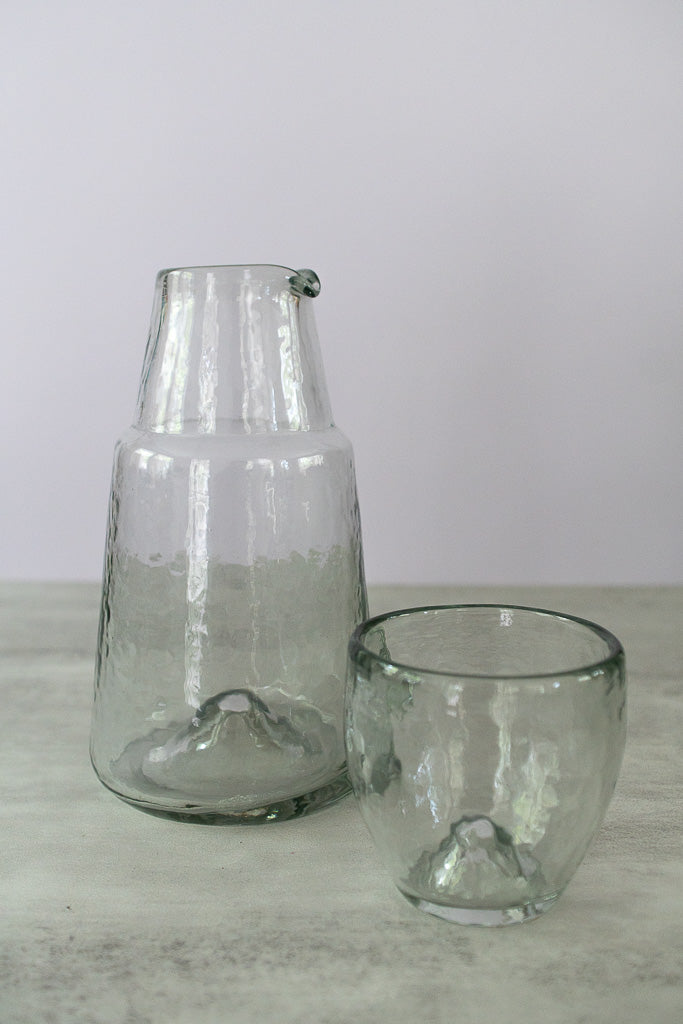 Treat your guests right with our stylish recycled glass bedside carafe set. The tapered, softly dimpled vessel features a pour spout up top and punt in its base, a detail shared by the rounded drinking glass doubling as its lid.