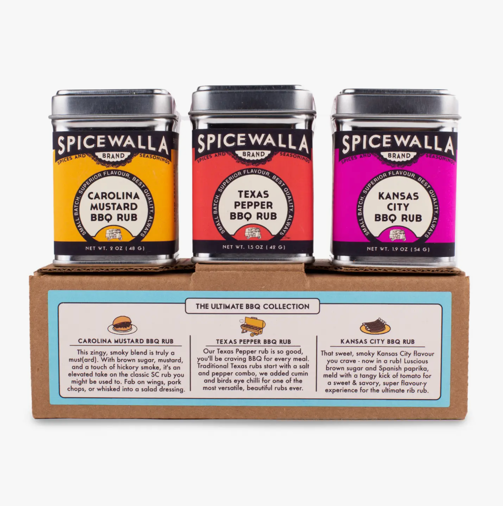 Whether you're grillin', smokin', dry rubbin', or sloppin' on the sauce, this 3 pack of bbq rubs will take your proteins (or veggies!) on a trip to three of the big time bbq regions in america. Tangy mustard flavours will bring you down south, spicy black pepper will lasso you westward to texas, and the sweet, tomato-y taste of our kansas city rub will remind you of that classic bbq chip flavour! 3 pack gift set includes: carolina mustard bbq rub, texas pepper bbq rub, kansas city bbq rub