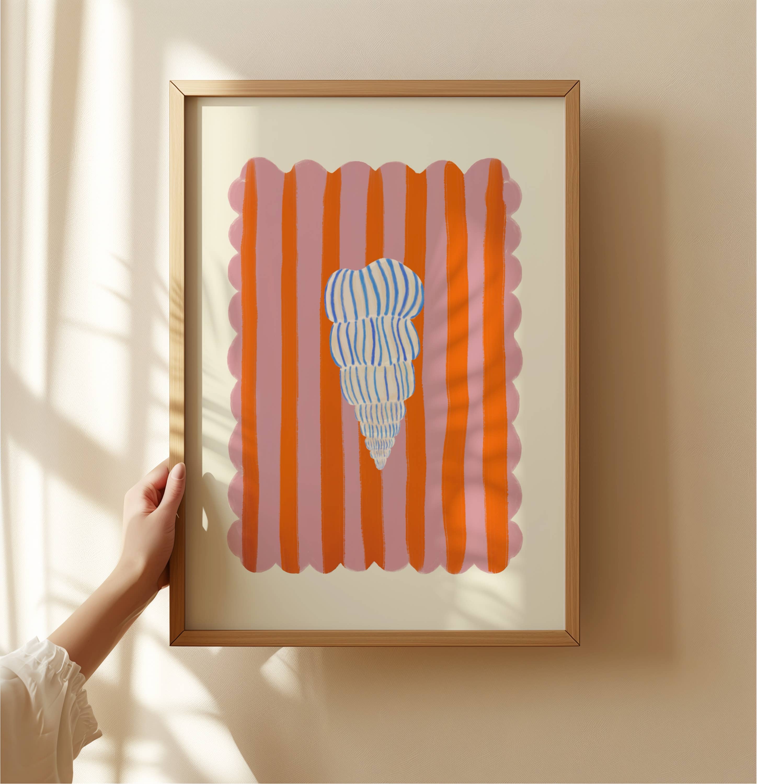 Striped Shell, Hand Drawn Abstract shell Drawing, shell Art Print, Maximalist Art , Colourful Home Décor, Pink Hand Drawn Art Print. Printed on 350gsm FSC-certified paper from sustainable sources. Packaged inside a biodegradable bag.