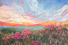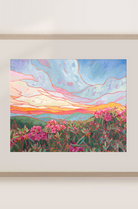 This gorgeous giclee print of a landscape painting is printed on 100% Cotton Paper with a smooth surface texture and would look so lovely hung in your home. Looking at it makes you feel like you are looking out a window at a breathtaking vista of a sunset and Rhododendrons. Each print is signed by the artist. Print measures 8x10. Frame not included. Made in North Carolina.