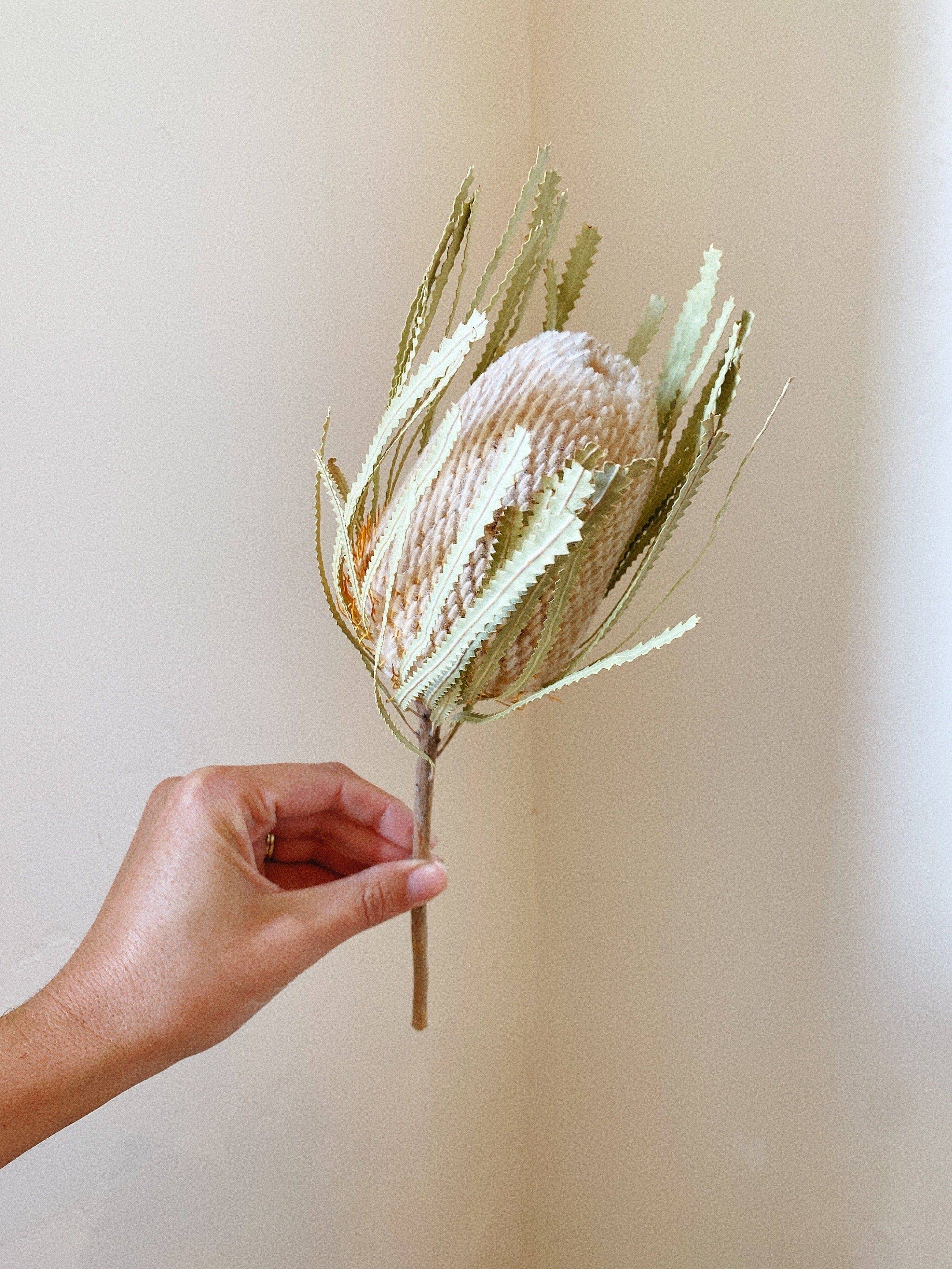 This statement single stem natural Banksia features creamy floral accents that will bring a pop of color and style to your home. Its natural beauty will add a touch of elegance to any room, making it a timeless addition to your décor. Price is for one stem.