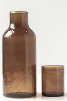 Form meets function in these stunning glass carafes. Each is handblown from recycled glass then meticulously hammered by hand for a truly unique finish. The set includes a carafe and lid that doubles as a small drinking glass. Ethically made by a woman-owned company, this recycled glass collection aims to support people and the planet. Our carafes are made from colored glass (not sprayed) to ensure the color will last a lifetime. Please note that these items are 100% handmade and slight size variations and imperfections may occur. - Dishwasher safe - 3.5 x 3.5 x 10 inches