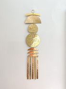 Artisan-crafted wall hanging/mobile made from hand-cut and hammered brass sheet. Ready to hang. Dimensions: roughly 14" tall x 5” wide. Slight inconsistencies, imperfections, and the natural beauty of brass are what make our pieces unique. Product notes. Please be aware that raw brass naturally tarnishes over time; a paste of baking soda and lemon juice applied with a cloth will shine it back up in no time. This is a wall hanging for decorative purposes; not intended for use as a wind chime. Not recommended for outdoor use.