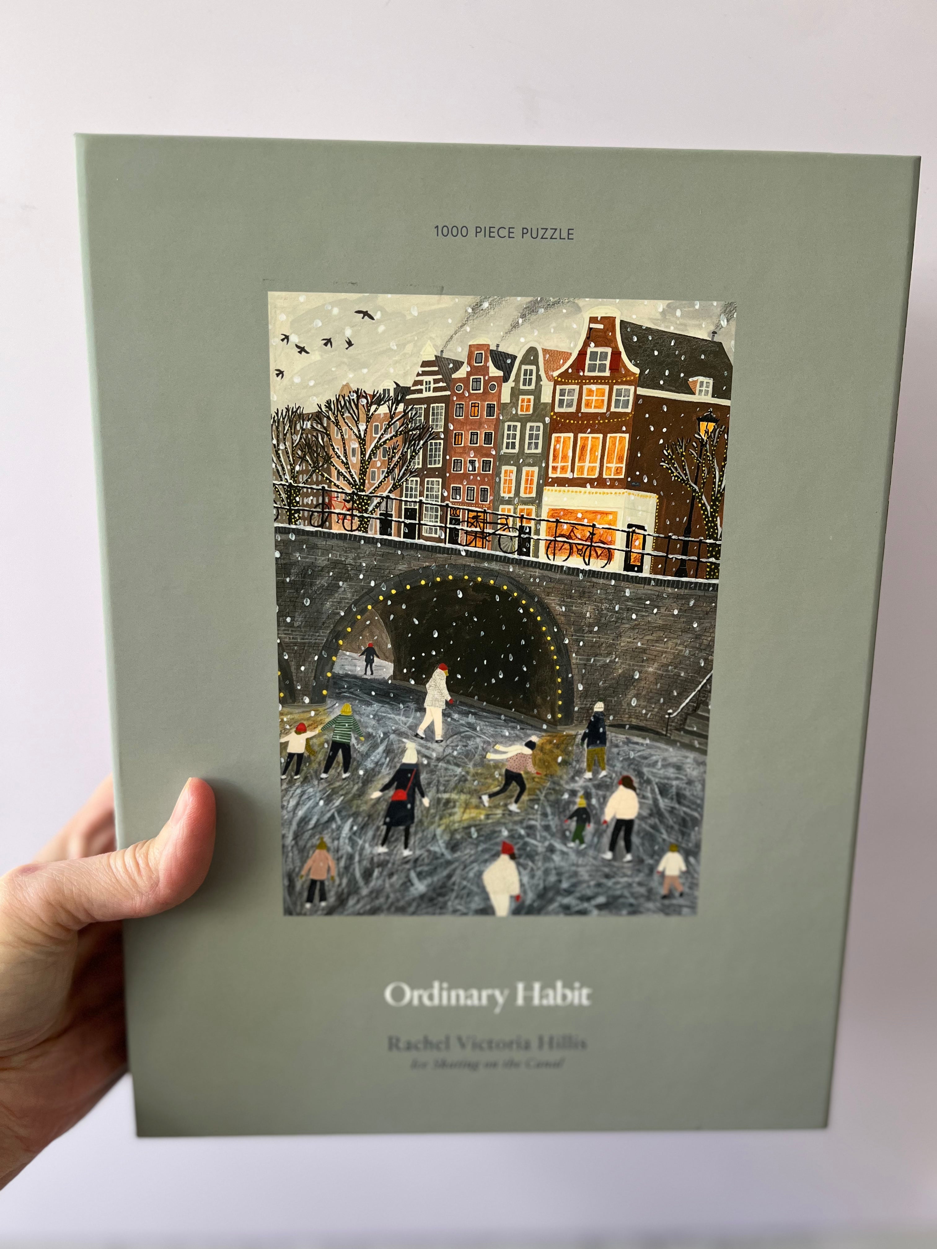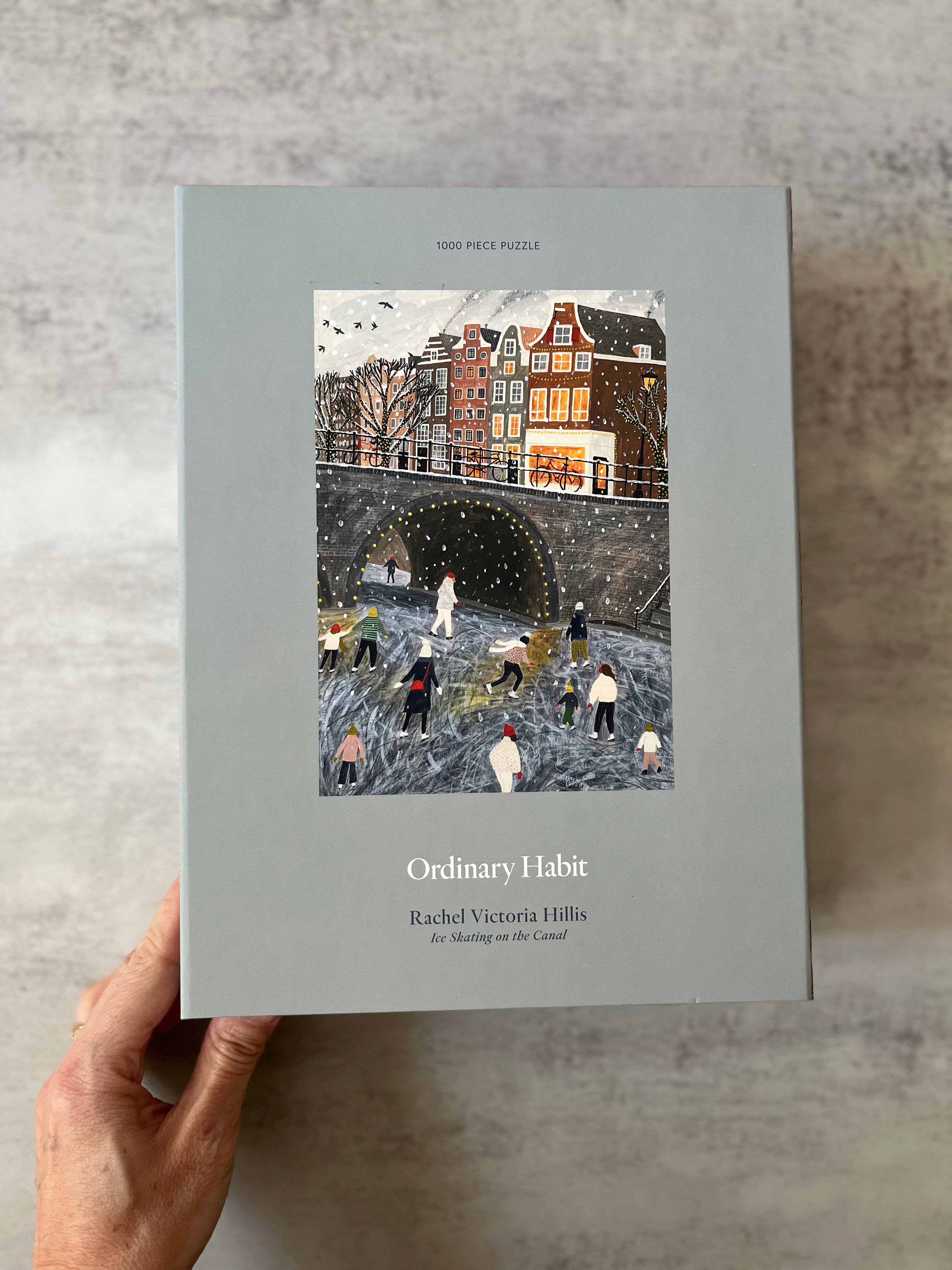 Delight in the challenge of piecing together the wintry scene that unfolds in Rachel Victoria Hillis’ Ice Skating on the Canal. Figures glide beneath the bridges that make for this iconic Amsterdam image, scarves trailing in the wind, while lights glow from within the beautiful houses. – 1000 piece puzzle – Completed Size: 26.9” x 18.9” – Box Size: 10.5" x 8" x 2.75” – Puzzle is finished with a soft-touch, glare-free coating – Drawstring cloth bag and artwork postcard included – Made with recycled materials