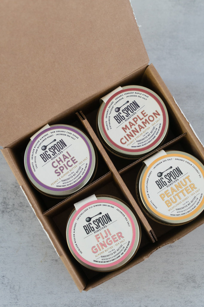 This box of peanut butters includes one TSA-friendly 3oz jar each of the following four recipes: Chai Spice Peanut & Almond Butter with Sea Salt Fiji Ginger Almond Butter with Sea Salt Maple Cinnamon Peanut & Pecan Butter with Sea Salt Peanut Butter with Wildflower Honey & Sea Salt All packed into a compact box perfect for travel, gifting, or hiding from your family (we won't judge).
