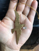 Artisan-crafted story ornament made from hand-cut and hammered brass sheet and genuine herkimer diamond. Ready to hang. Dimensions: ornament measures roughly 3” wide x 4.5” tall including hanging twine. Product Notes: Please be aware that raw brass naturally tarnishes over time; a paste of baking soda and lemon juice applied with a cloth will shine it back up in no time.