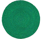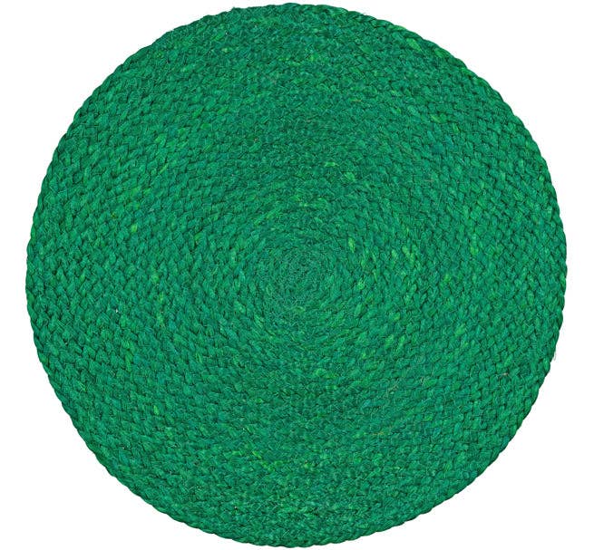 Kelly Green Round Jute Placemat. Woven from finer, silkier, natural jute fibers by skilled artisans, a round jute serving mat / placemat, spun from a finer fiber creating this silkier finish. No two pieces are exactly alike, suitable for everyday dining, jute is a natural insulator so great at protecting the table from anything hot. 14'' D Wipe clean only