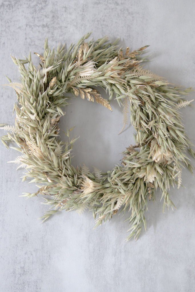 Bring the outside in and create an elegant festive moment in your home. This beautiful dried flower wreath features dried flowers in natural colors on a gold ring and a cream ribbon for hanging. Measures approximately 6.5" diameter.