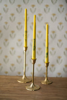 We searched and weren’t able to find floral inlaid tapered candles, so we created them! Our designers designed a set of three soy and beeswax candles that fit perfectly in our brass candle holders. The florals in each candle are real flowers that have been dried and placed in the wax candle. These yellow candles feature yellow flowers and are a perfect way to brighten up a room!