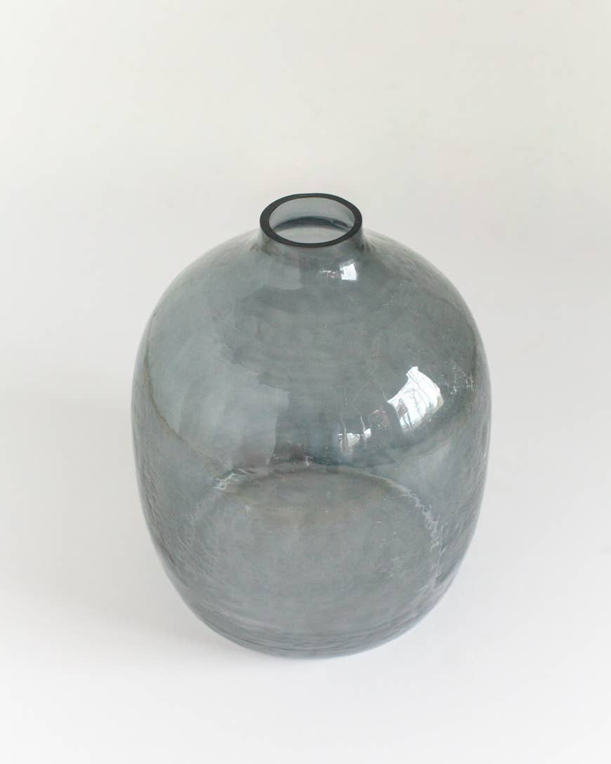 This stunning vase is a perfect union of form and function. Its subtle hand-hammered finish adds a depth of of eye-catching texture that is truly unique. We love how beautifully it showcases both wet and dry arrangements but that it also makes a beautiful statement piece all on its own. Each is made from 100% recycled glass. 10 x 10 x 12 in Please note that due to the artisanal nature of this product, slight variations in size and color will occur.