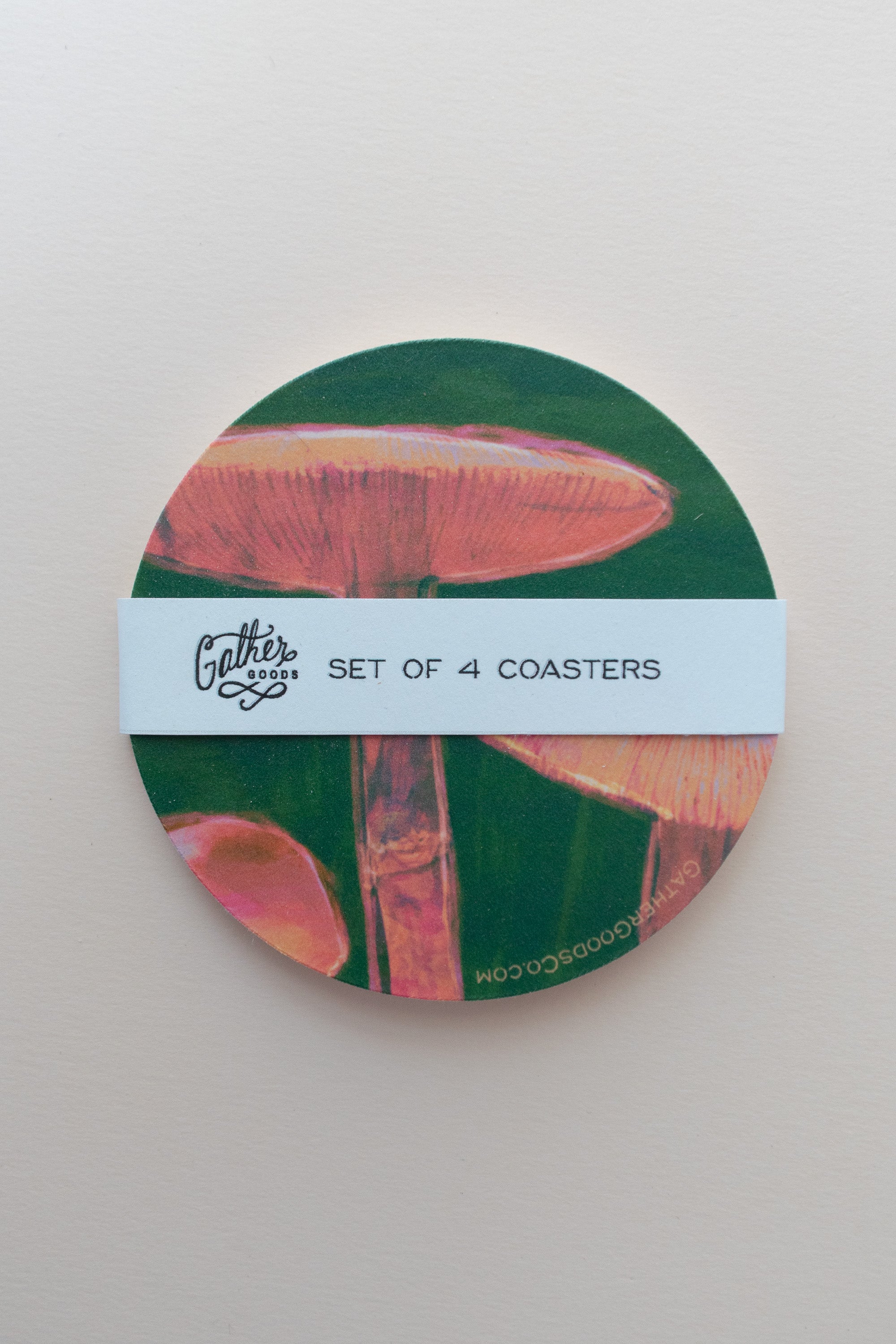 These colorful mushroom art coasters come in a set of four and make for fun and whimsical home decor, barware or party favor. They are bright and vibrant featuring neon colors of pink, orange and kelly green and are eco-friendly because they are made from the plant shavings of ethically harvested trees. They are very absorbent and last for hundreds of uses. These mushroom coasters are made with 60pt paper and measure 3.7" in diameter. They come in a set of four and feature a belly band around them. The whimsical art makes for a great and colorful hostess gift idea especially when paired with a basket, napkins, a drink or a candle and are fun in a food gift box as well. If your shop features food items, these coasters are a good add on accessory to sell in your shop. Perfect for your customers who are foodies, who love to throw a party, forage or hike and be outdoors, are into wilderness themed gifts or just fun whimsical items. These are also wonderful for an at-home or restaurant bar.