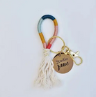 The fiber wrapped keychain is handmade using recycled cotton rope wrapped in brightly colored cotton thread and tied off using metallic twine. Each keychain includes a gold key ring with lobster claw clip. This stylish keychain makes a fun addition to your purse, backpack and even makes a great gift! Crafted with recycled cotton rope, multi-colored cotton thread and metallic twine. Each keychain is 4" long.