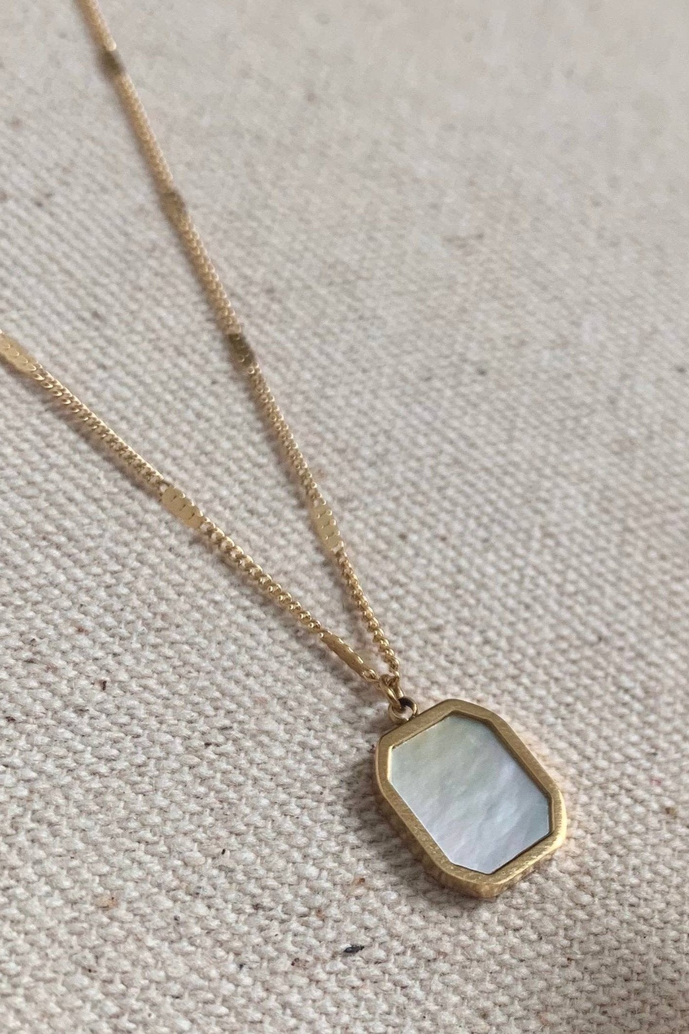 A delicate bevelled edge pendant with a mother of pearl center. Necklace chain is a lightweight curb chain with a compressed detail that catches the light. * Polished gold plated finish, that won’t fade or tarnish