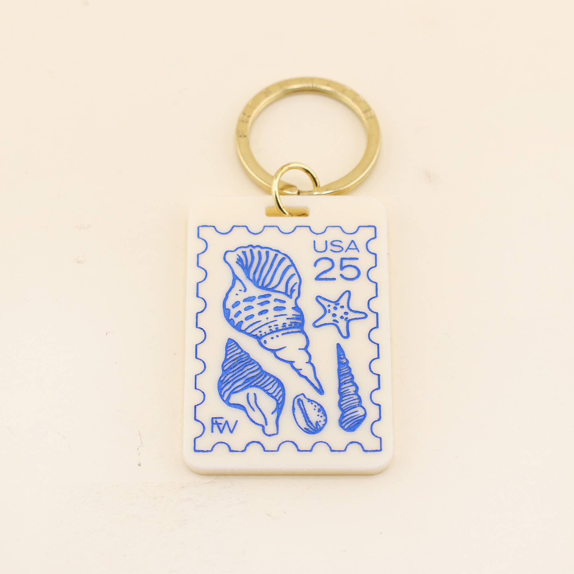 This Seashell Postage Stamp Keychain is the perfect beachy accessory all year round! Size: 3.25" L by 1.18" W - Made of high-quality acrylic with color-fill and solid brass hardware - Waterproof