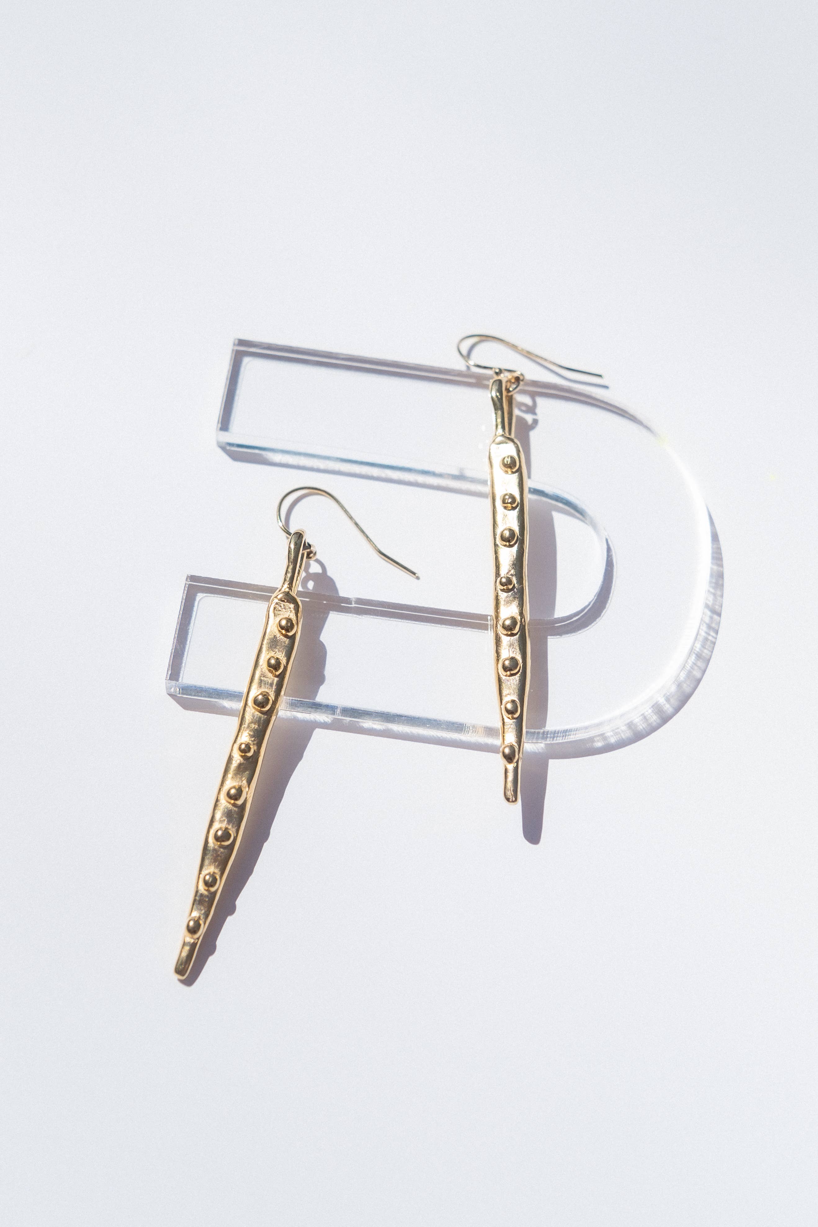 Hand-carved in wax and cast in solid bronze, these earrings showcase a unique organic design. Bronze options feature gold-fill ear wires, while sterling silver earrings come with sterling ear wires. Each pair is approximately 2” in length.
