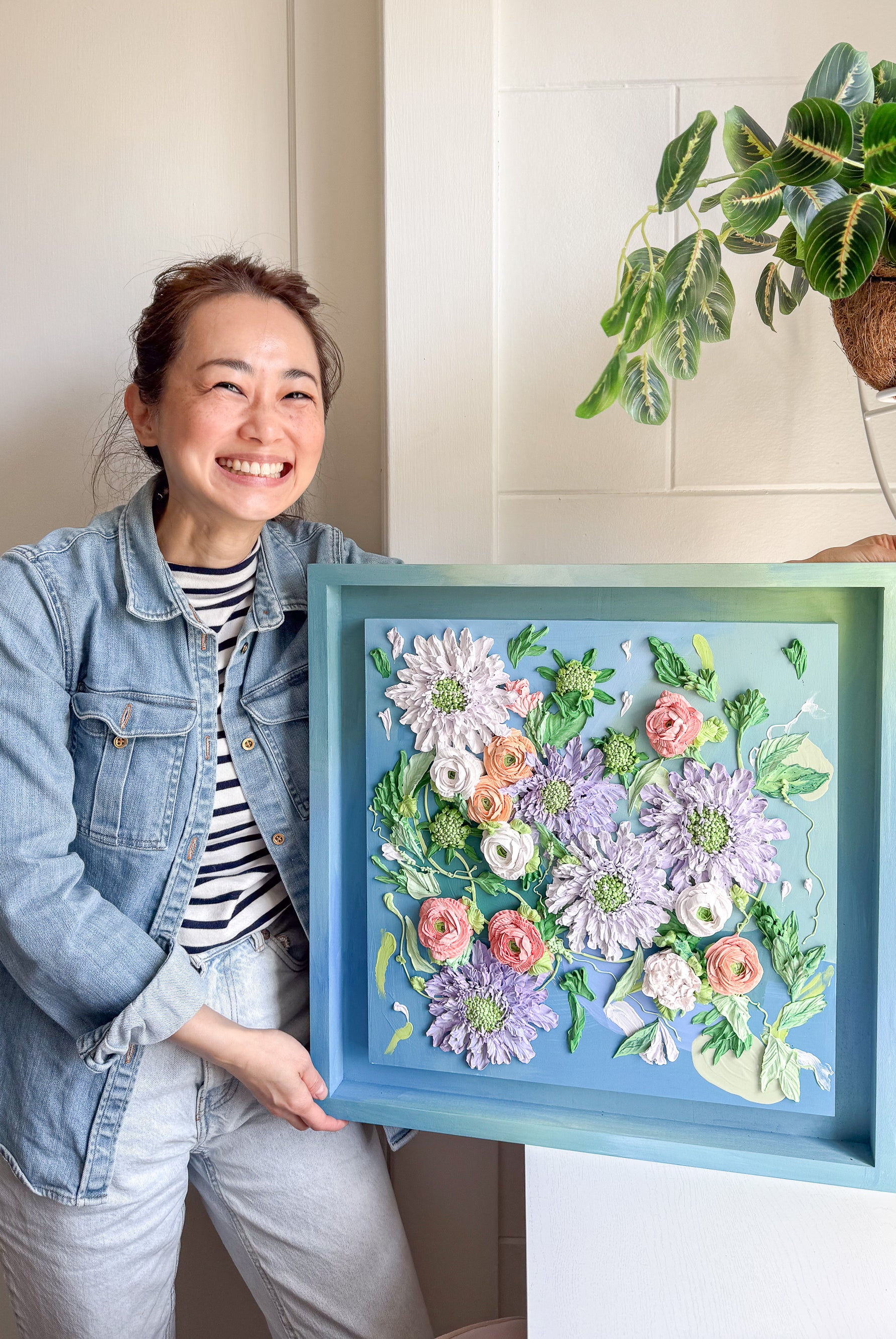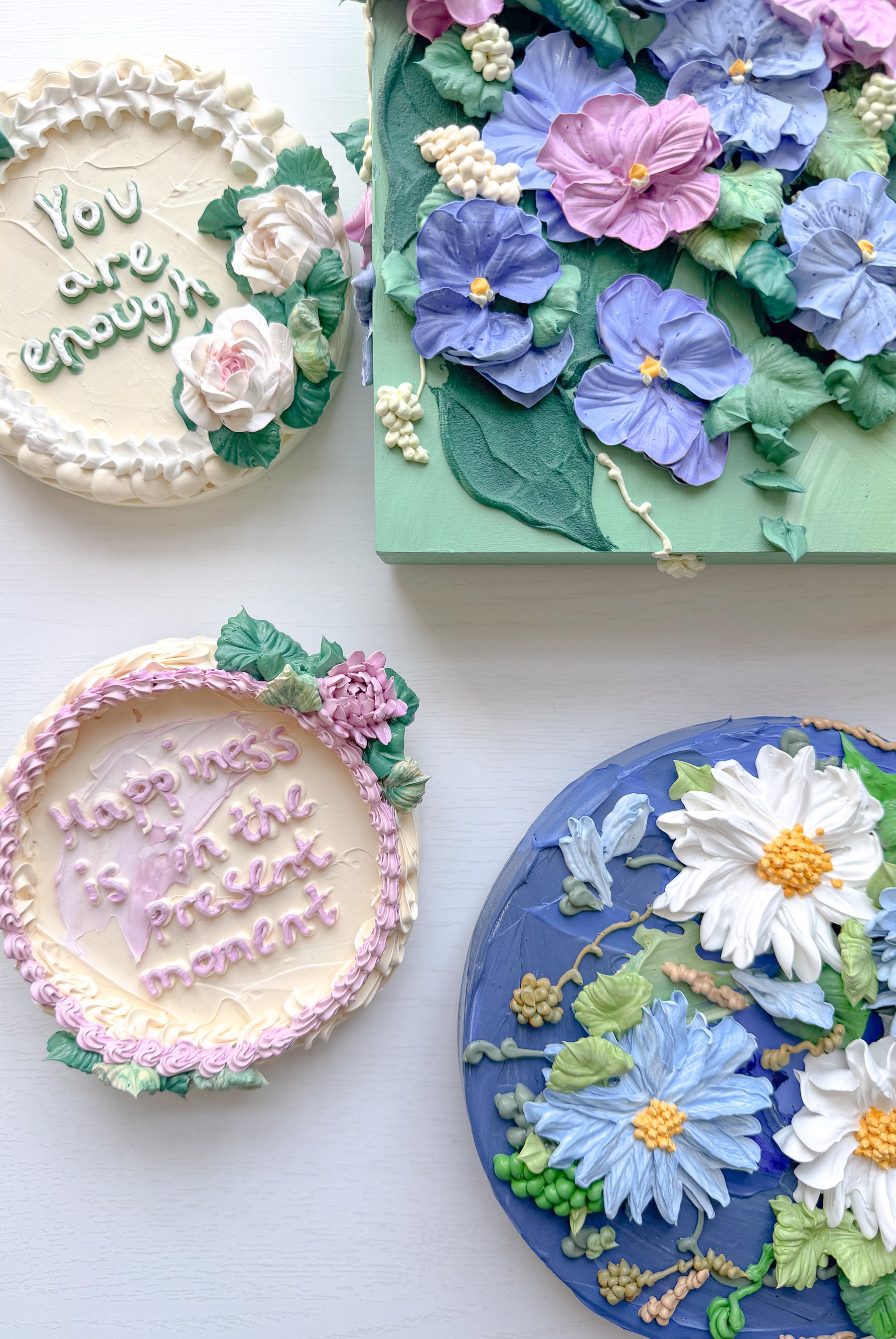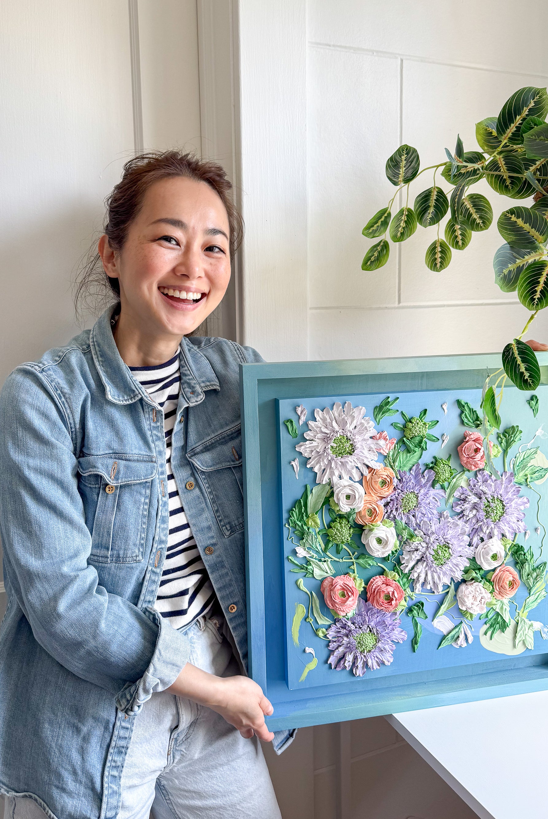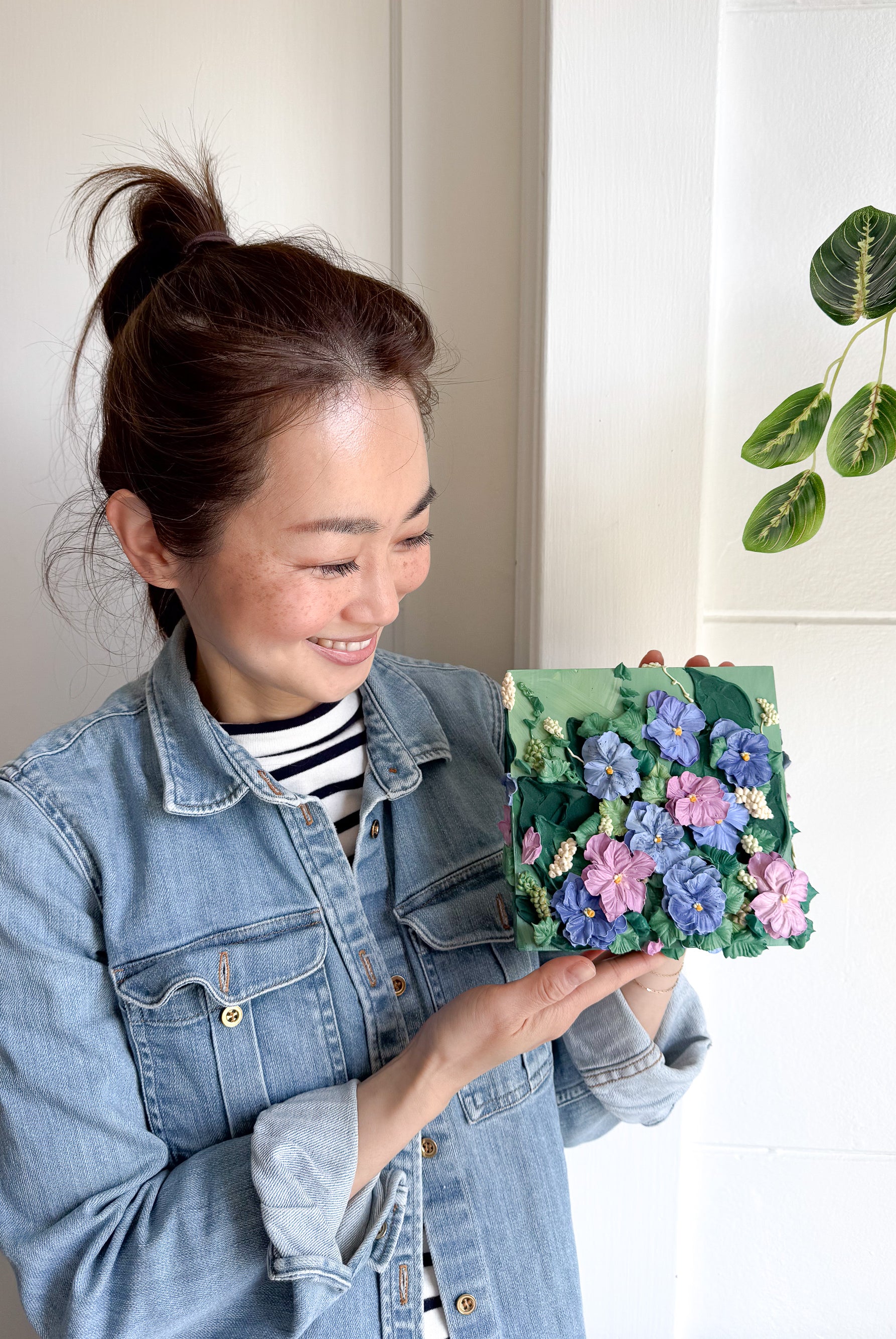 Meet local artist Ji Ahn Kang who makes beautiful three dimensional artwork featuring florals that look edible but are actually made with a paint medium. Ji Ahn actually went to fine art school in South Korea and then later became instagram famous for her cake decorating and even wrote a book about her skills. Wanting to transition to an art form that was more permanent but still had the same feel as her cake art, this art form emerged. Ji Ahn has original art pieces and art prints for sale in-person at Gather Goods Co and online. We are hosting a free meet the maker event on April 9th from 6-8pm at the shop.