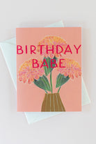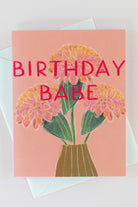This pretty greeting card features a flower in a vase with the phrase "Birthday Babe".