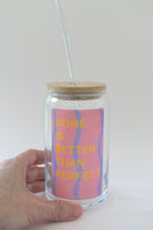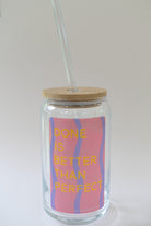 This glass can is perfect for iced coffee on the go. Featuring a self affirmation reminder that getting it done is more important than procrastinating. With vibrant pink and purple wavy stripes and bold yellow text this will be your go-to cup for water, tea, coffee or whatever favorite drink you sip from throughout your day.