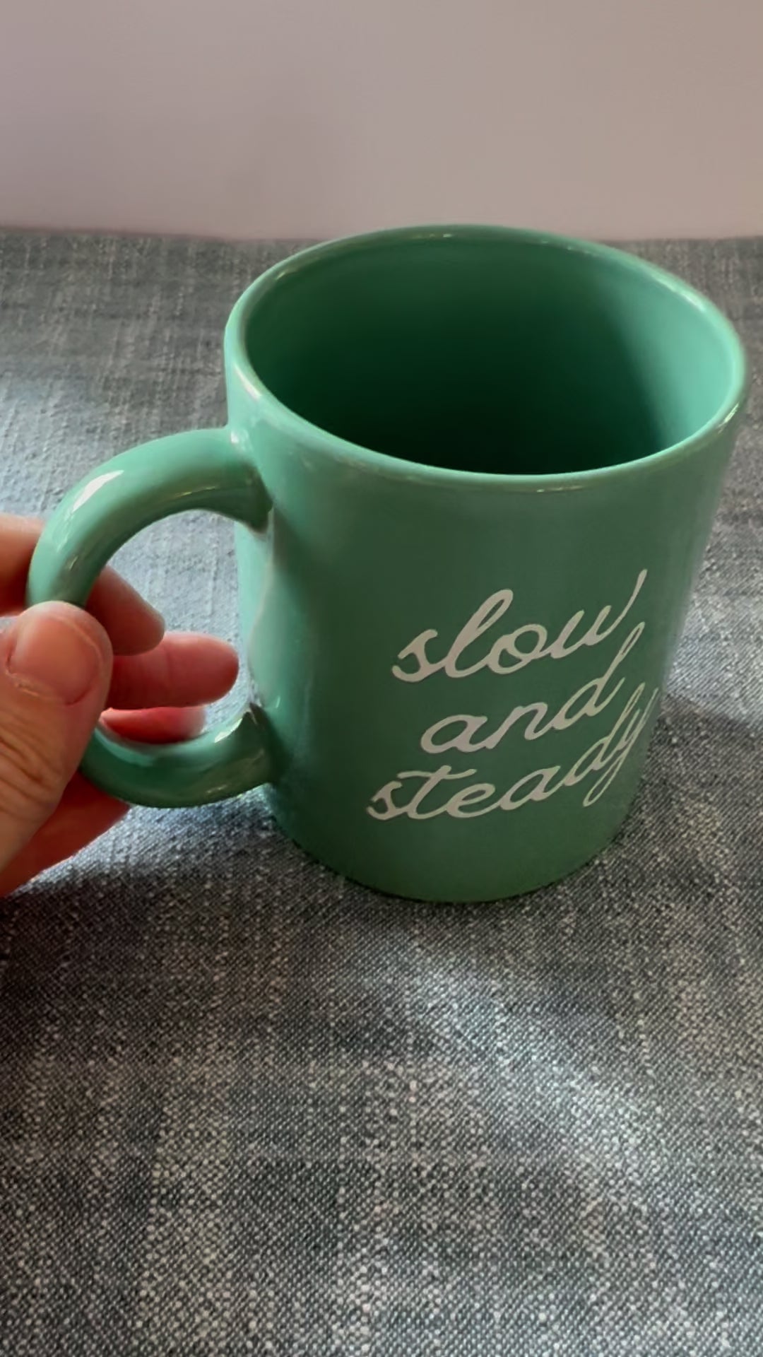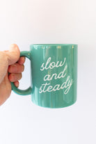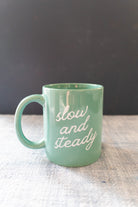 This lovely green mug with the phrase slow and steady in a white script font is a little self care affirmation and reminder to yourself every time you drink your morning coffee or tea. Holds 11oz. and measures 3.1" W x 3.75" H x 3.15"