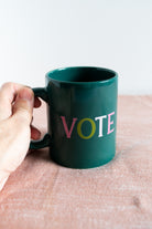Vote for what matters. This lovely green mug with the phrase vote ni an assortment of colors, a pale pink, a hot pink and an olive green, is a reminder to yourself every time you drink your morning coffee or tea. Holds 11oz. and measures 3.1" W x 3.75" H x 3.15"