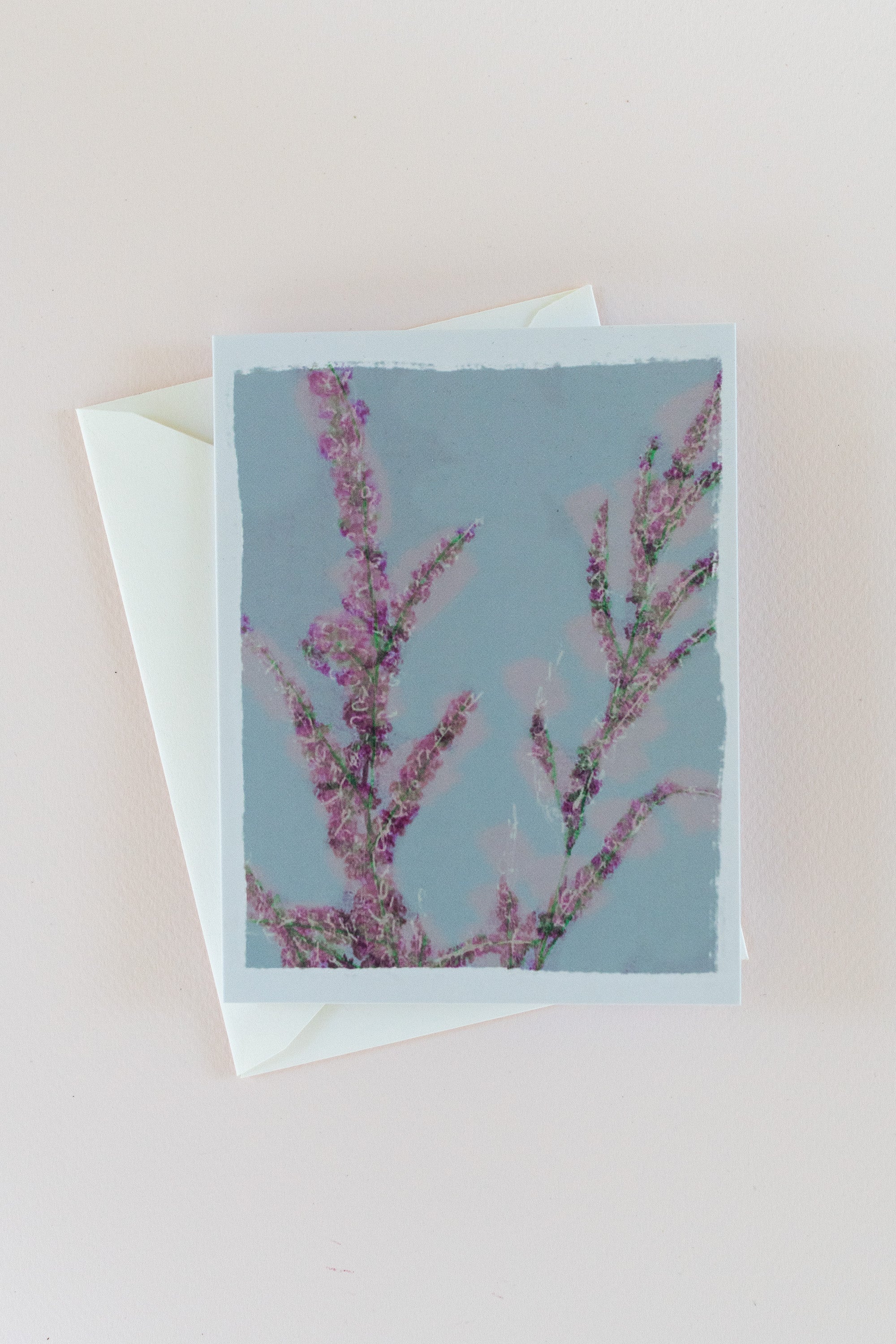 This pretty greeting card features a soft, painterly design of a heather plant.