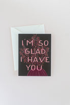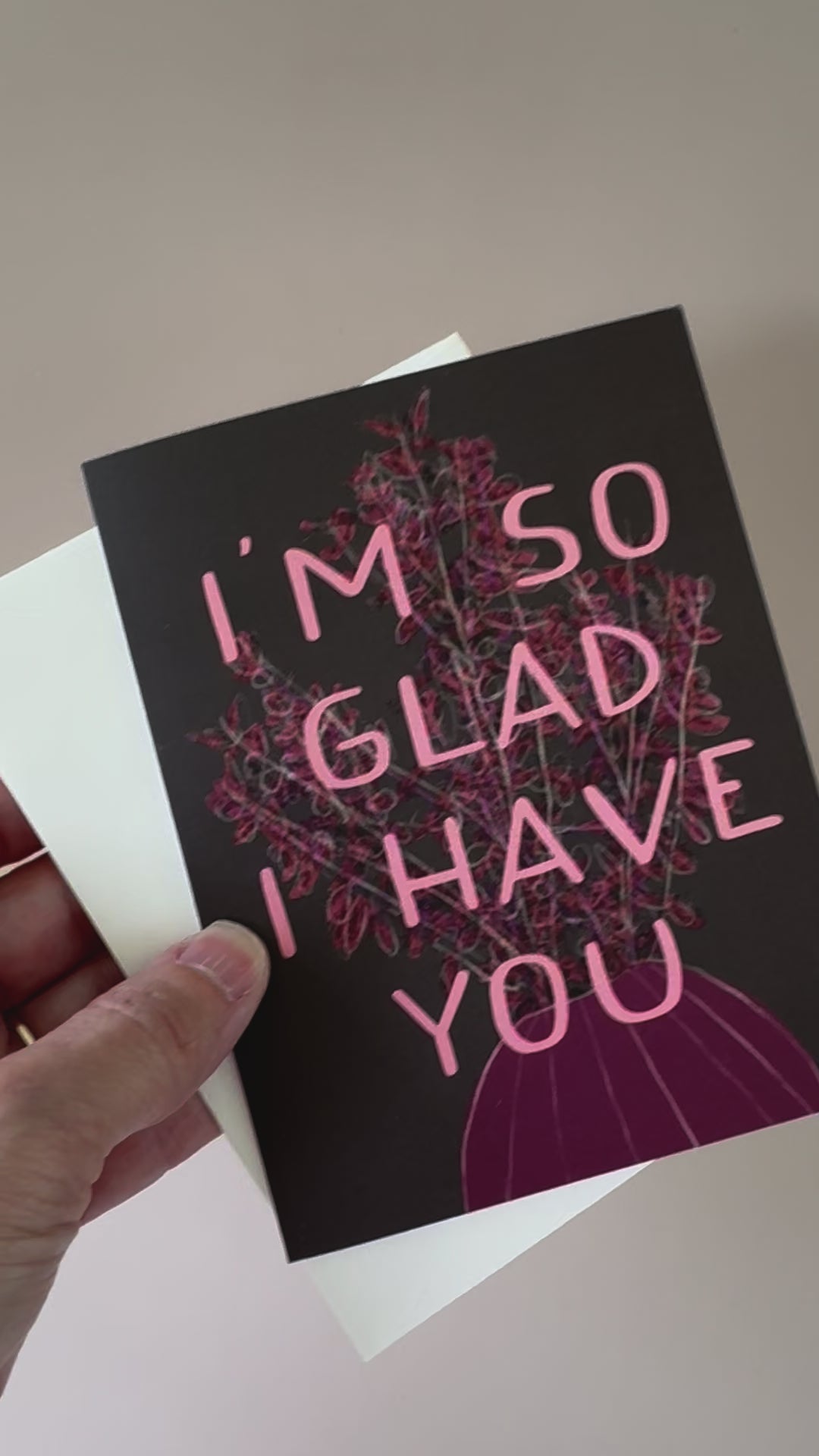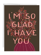 This pretty greeting card features a flower in a vase with the phrase "I'm So Glad I Have You".