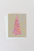 An illustrated holiday card of a pink retro Christmas tree on a sage green background. The greeting card is blank inside for your custom handwritten message and comes with a cream colored envelope. Also available as a set.