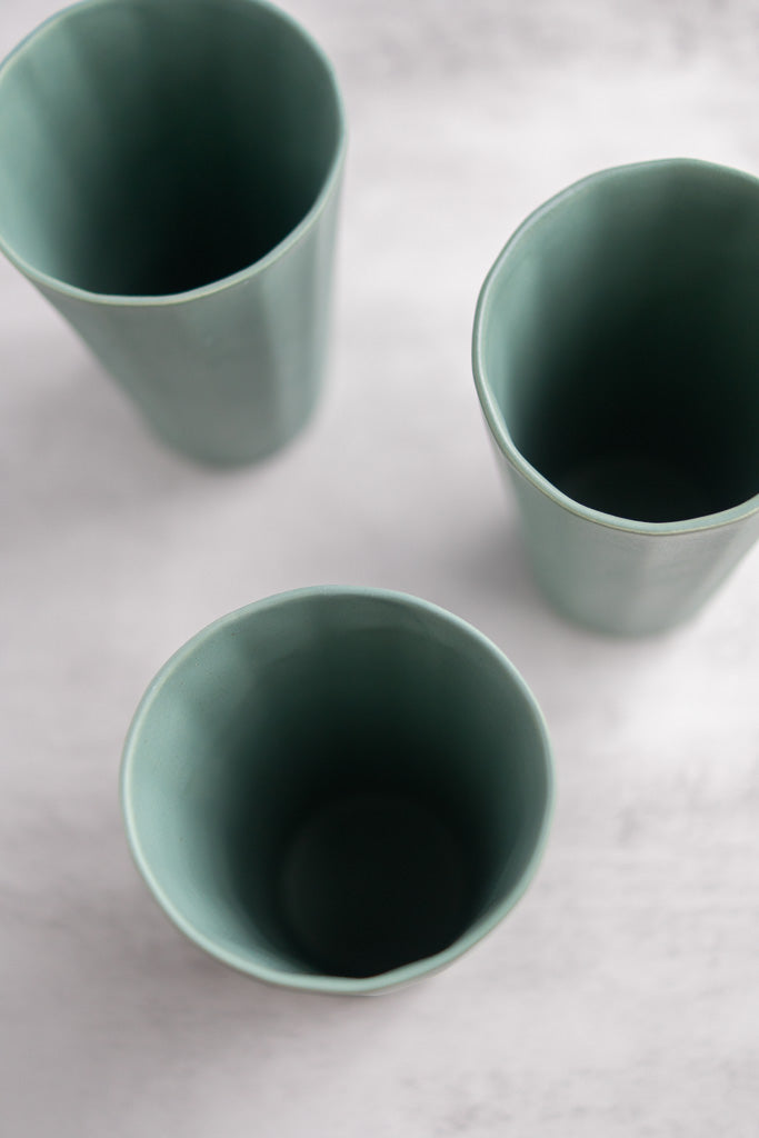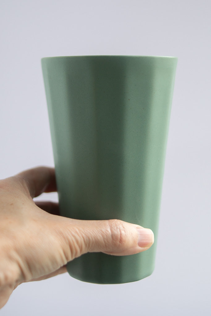 This gorgeous porcelain pottery pint cup for drinking is a lovely vessel to have as a versatile piece of functional art. In addition to a drinking cup it also makes a beautiful vase. Measures 3.25" x 3.25" x 5.75" and holds 16 oz. Microwave and dishwasher safe. Made in North Carolina.