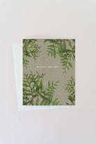 An illustrated Christmas card with an evergreen branch pattern on a sage green background. The greeting card is blank inside for your custom handwritten message and comes with a cream colored envelope. Also available as a set.