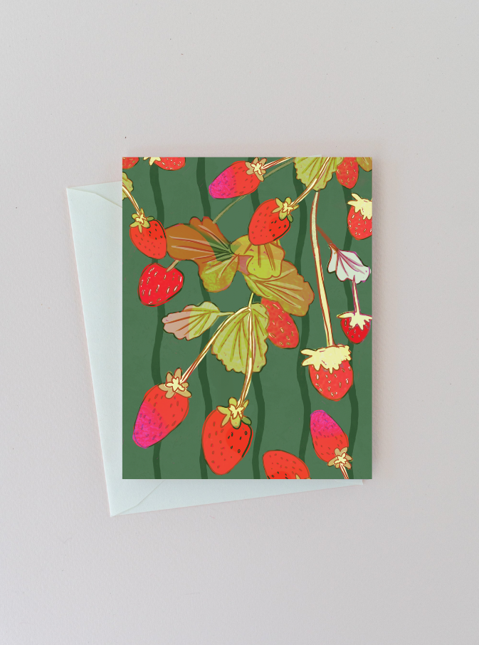 This strawberries note card measures 4.5"x5.5", size A2