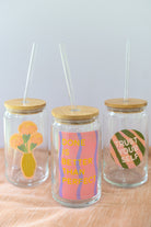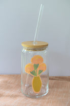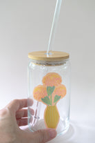 This glass can is perfect for iced coffee on the go. Featuring a retro illustration of a bouquet of zinnia flowers in a vase. With bright colors of orange, green and goldenrod, this will be your go-to cup for water, tea, coffee or whatever favorite drink you sip from throughout your day.