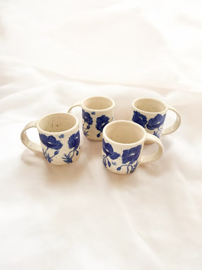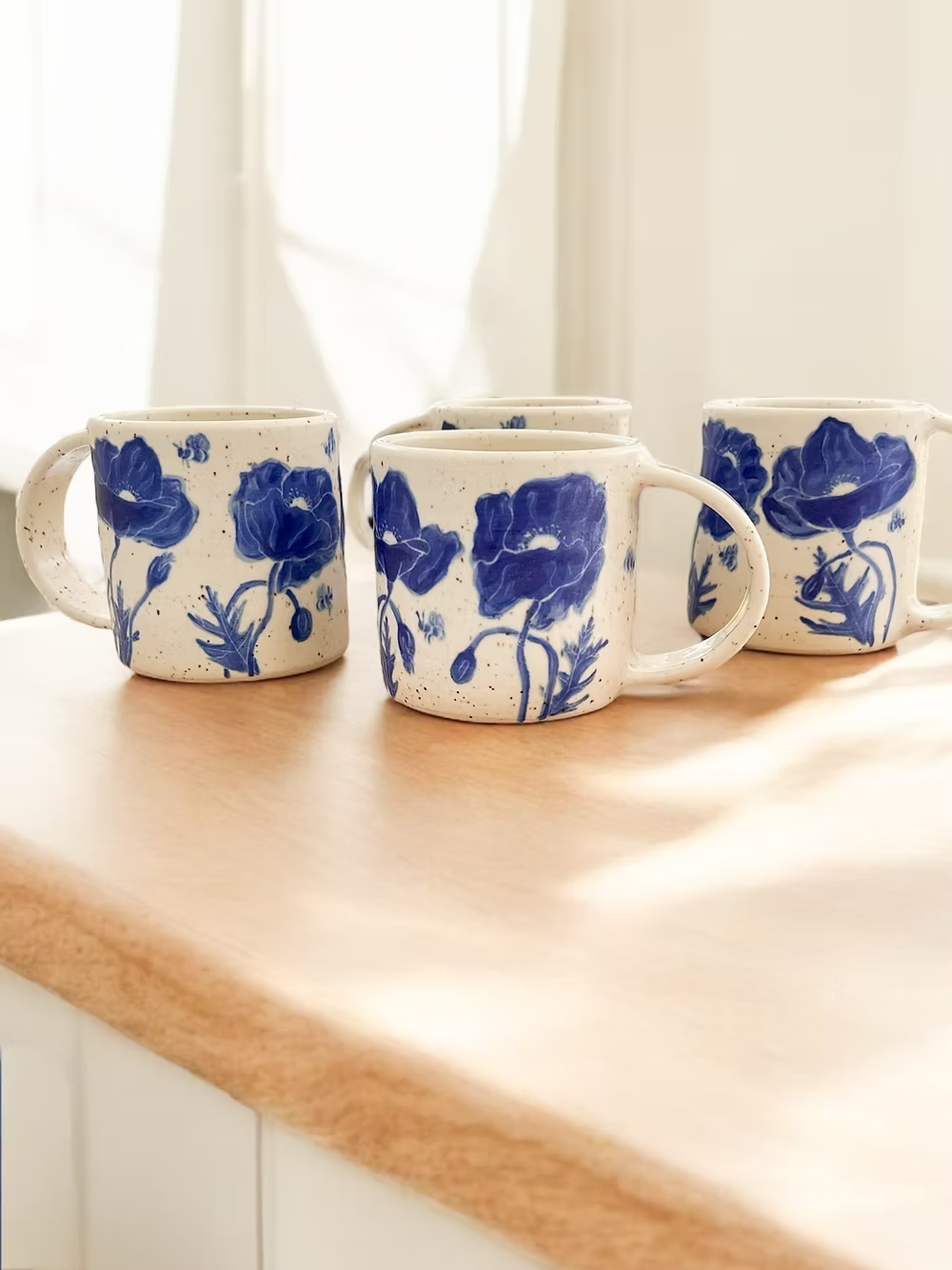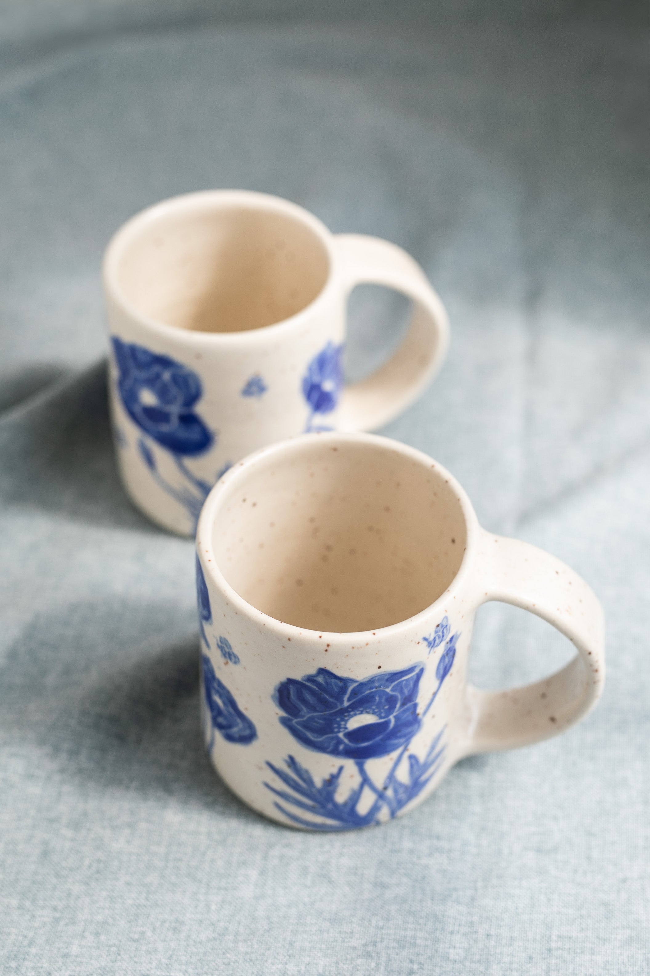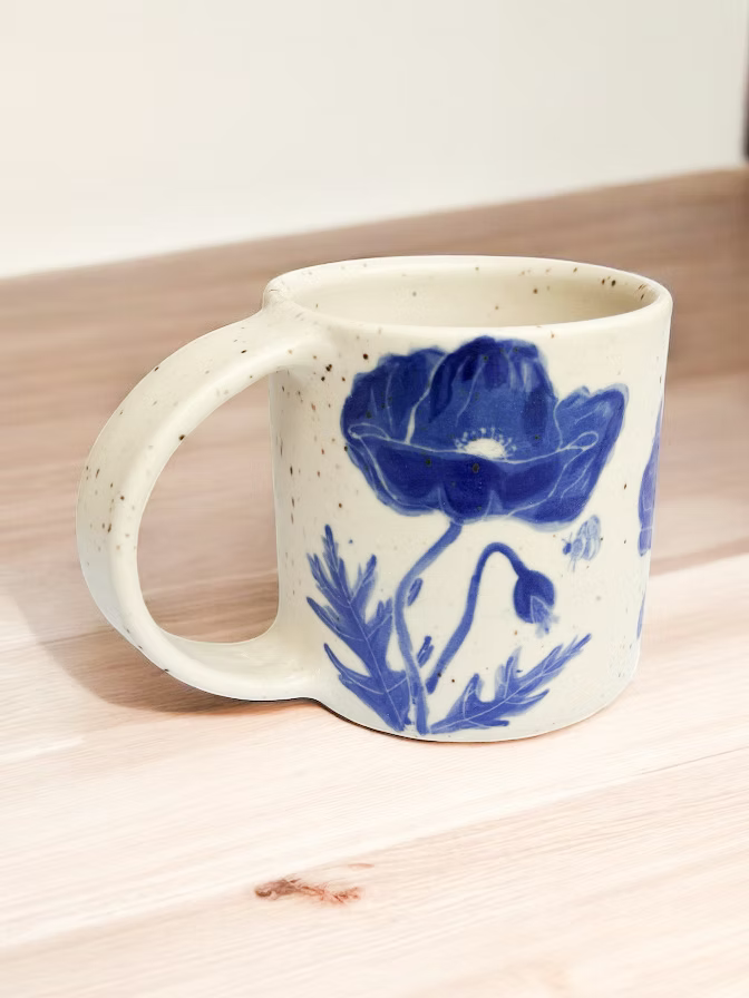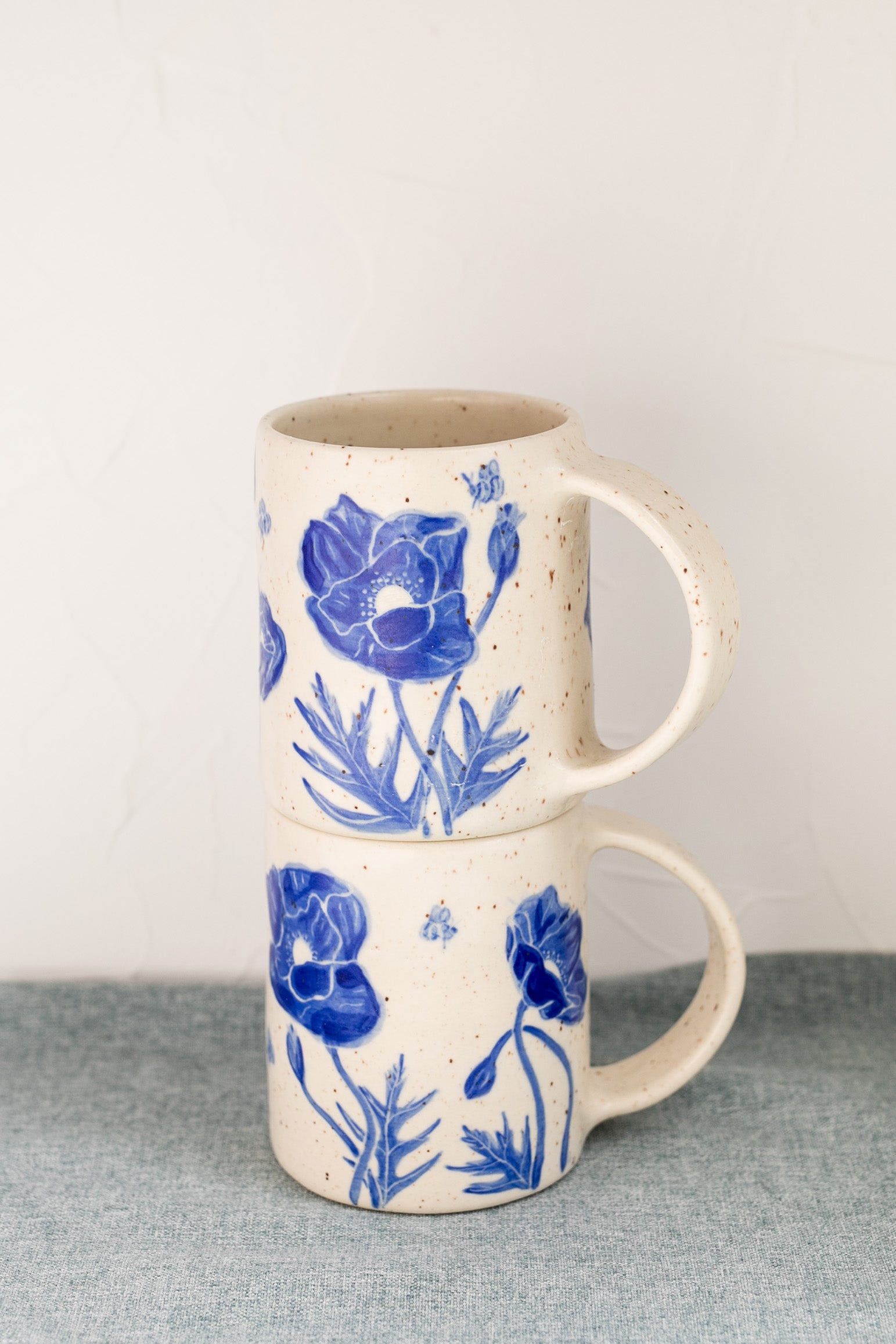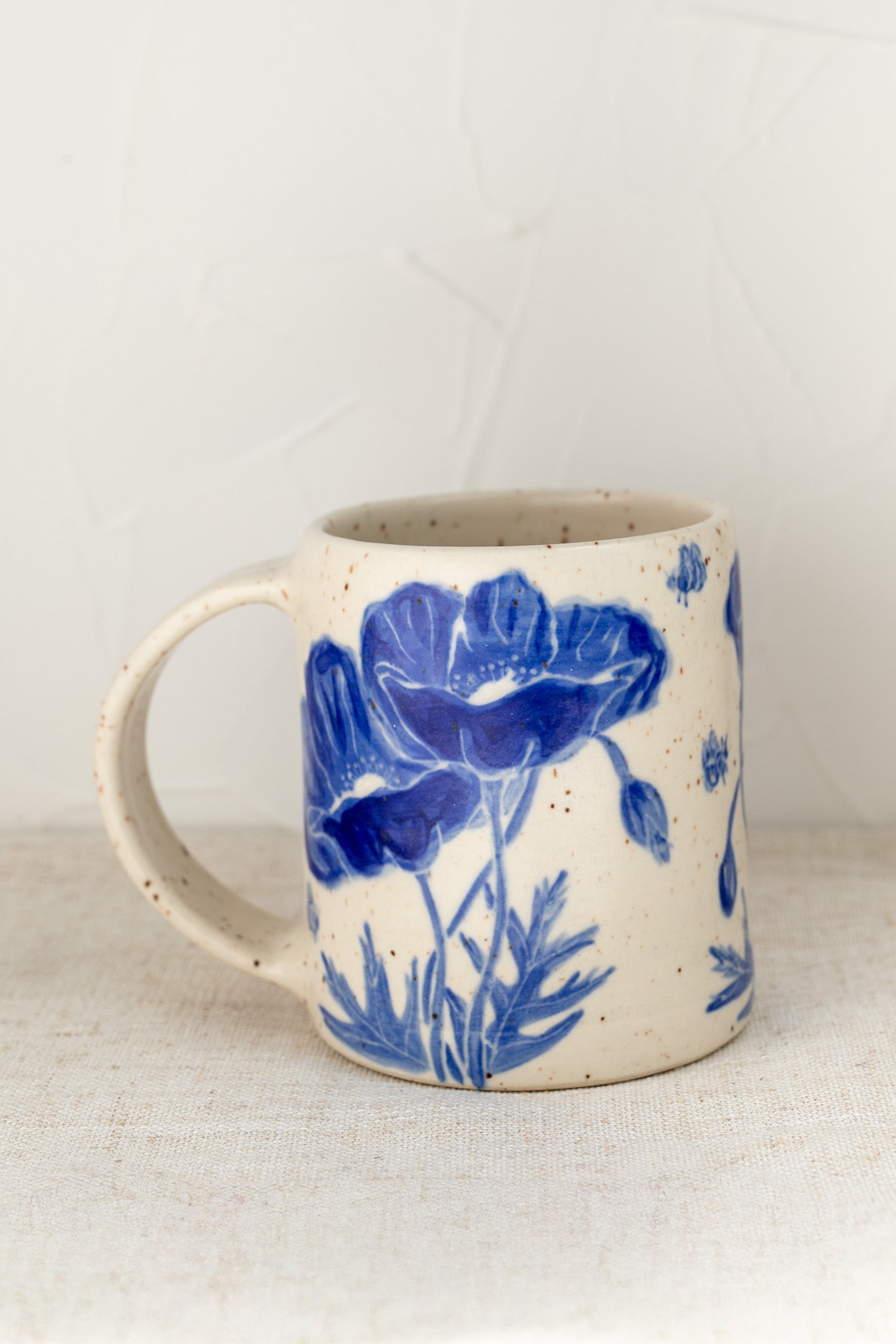 Handmade Ceramic Mug with Blue Poppy Art, Hand painted