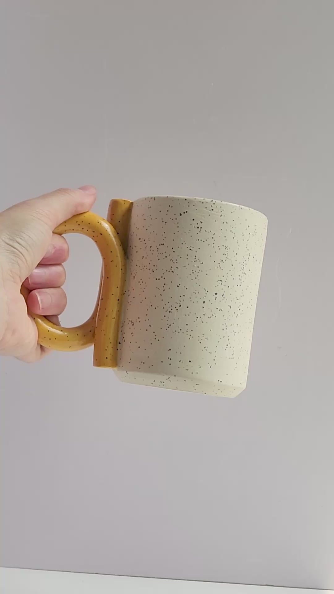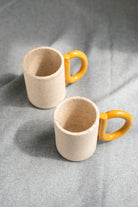 Have your favorite drink in these handmade ceramic mugs with looped yellow handle. Its soft, rounded shape and comfortable handle make it lovely to hold and drink from.