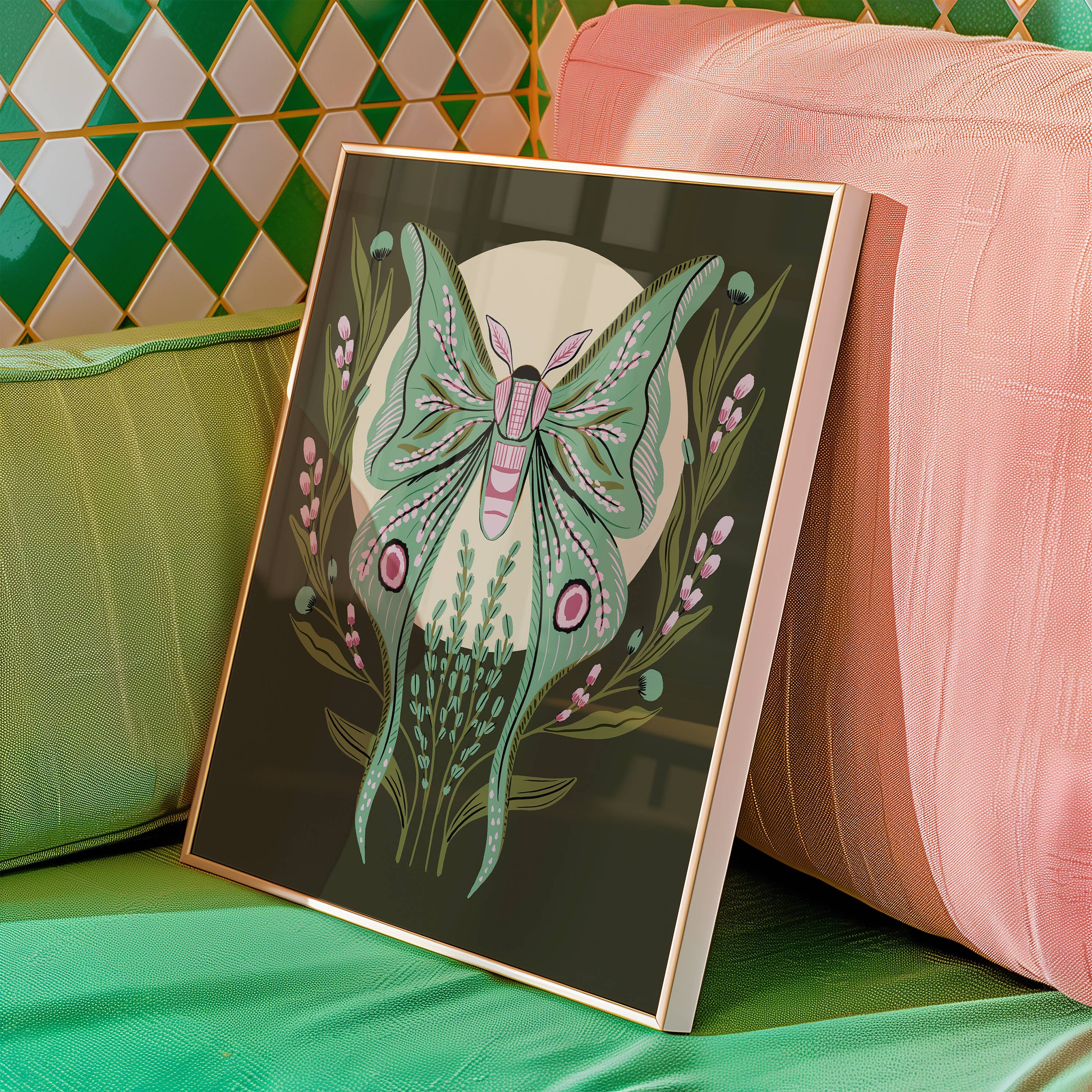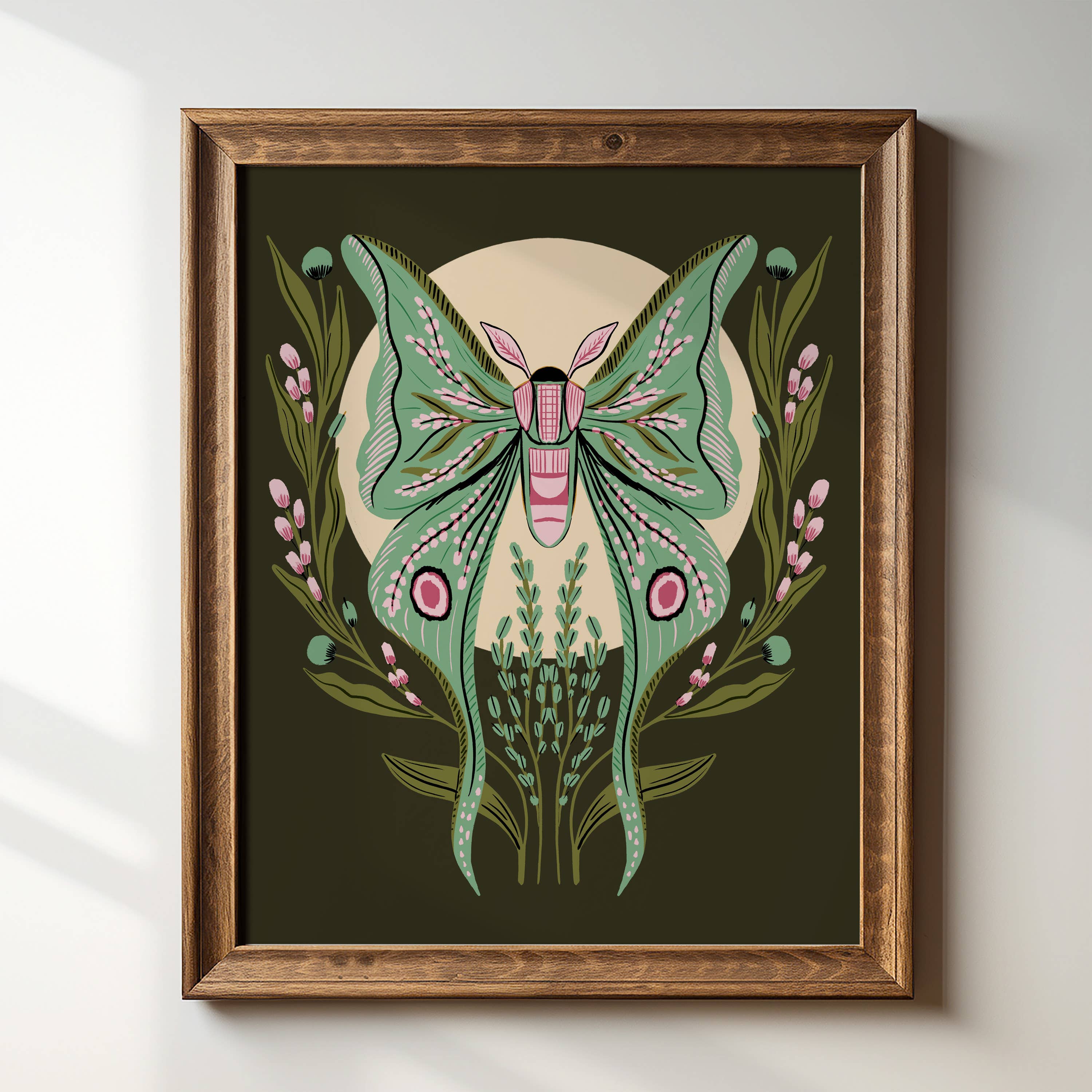 This is an 8 x 10 art print of a Luna Moth rising from the moon. Mystical Moon energy :) It is an original illustration by independent female artist and business owner, Tara Reed, who hopes her art brings you a bit of joy. Each giclée print is handmade in our studio with archival paper and pigment inks made to last up to 200 years. Prints comes signed and individually packed in a clear sleeve with a sturdy backing board. *frames not included*