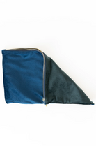 Need to take your tiles on the go? Toss them in this velvet tile bag and head out to your next game. This velvet tile bag comes in a beautiful two tone color-block combination with deep forest green on one side and luxe navy on the other side. The bag is lined with a soft gray velvet.