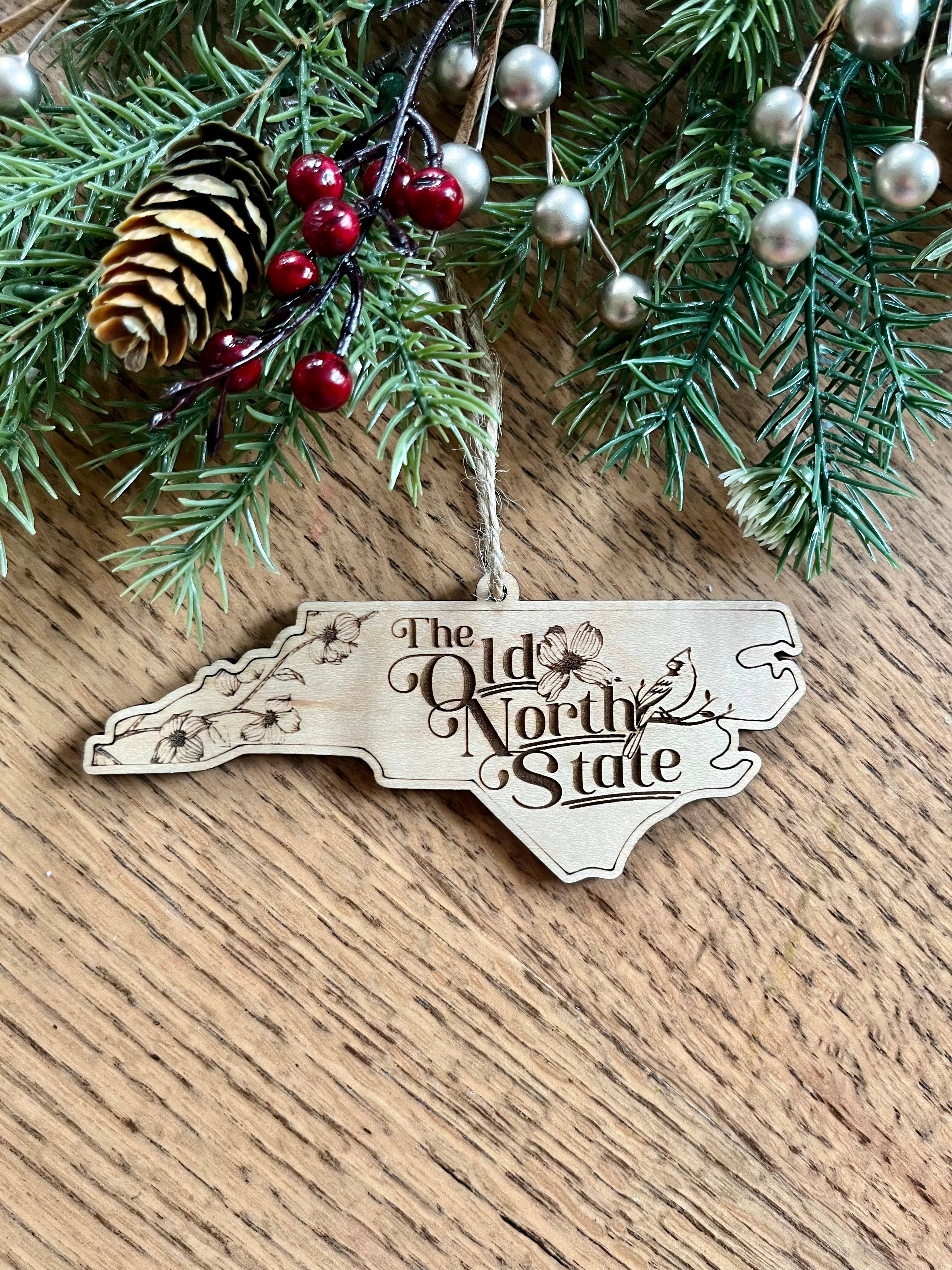 Old North State North Carolina NC Wooden Christmas Ornament, Dogwoods