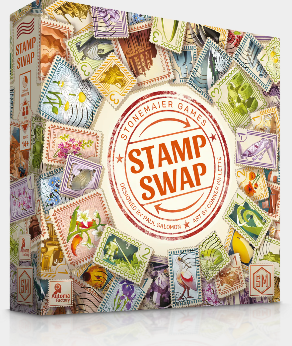 Designer Paul Salomon (Honey Buzz, Genotype) brings stamp collecting to life on tabletops in Stamp Swap! Draft from a public pool of face-down and face-up tiles (along with some bonus cards), then simultaneously divide them into 2 groups. You will select one group from another player and keep the group of yours that isn't selected. Organize your growing collection each round and score 1 of 4 goals--choose wisely, as you can't score that goal again.