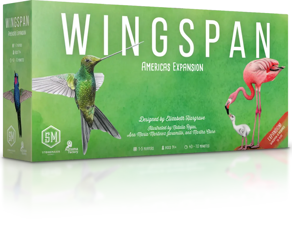 This fourth Wingspan expansion explores the birds of Mexico, Central America, South America, and the Caribbean. This incredibly biodiverse and abundant region is home to more than 3,000 bird species, including the birds with the smallest and largest wingspans in the world (the Bee Hummingbird and Snowy Albatross, respectively).