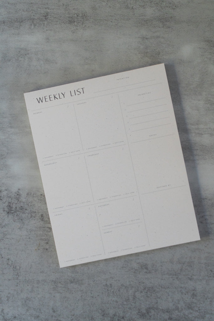 A minimal desk pad designed to help you craft your ideal week. Complete with undated daily planning, a priority list, open area for notes and inspirations as well as daily wellness check ins to allow you to live to your fullest potential. 8" x 10’’ 52 sheets. Printed on luxe recycled stock made from 30% post-consumer waste. Thick chipboard backing.