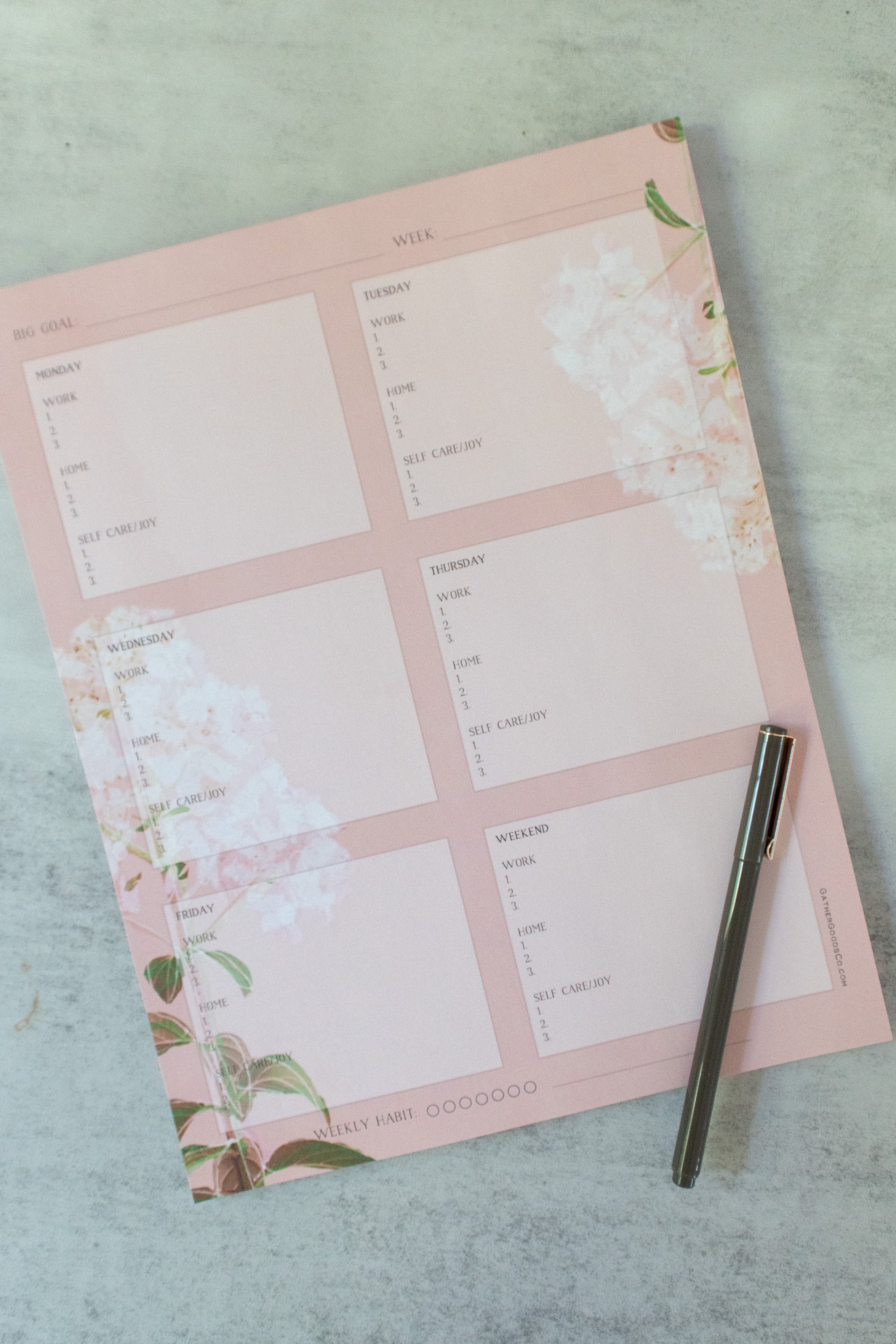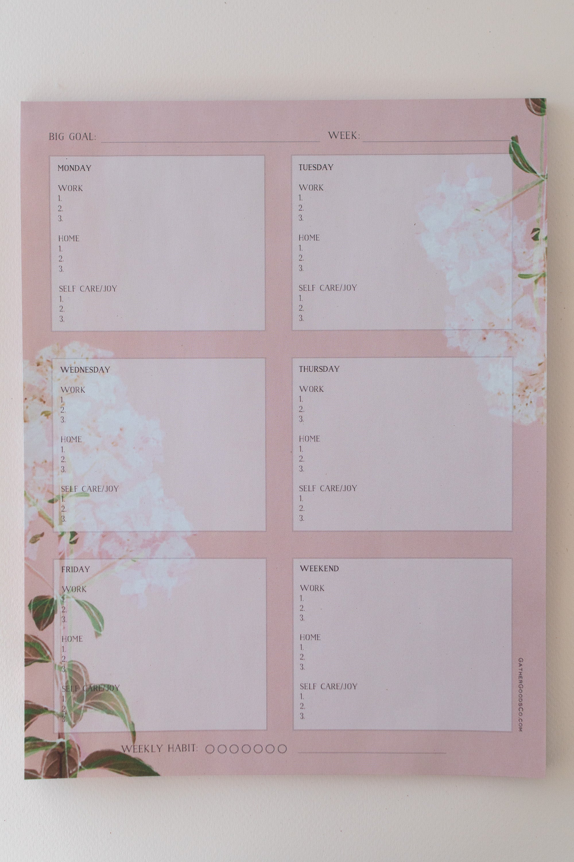 Weekly Planner Pad 8.5 x 11 – Goal Setting & Habit Tracker with Hydrangea Floral Design in Pink